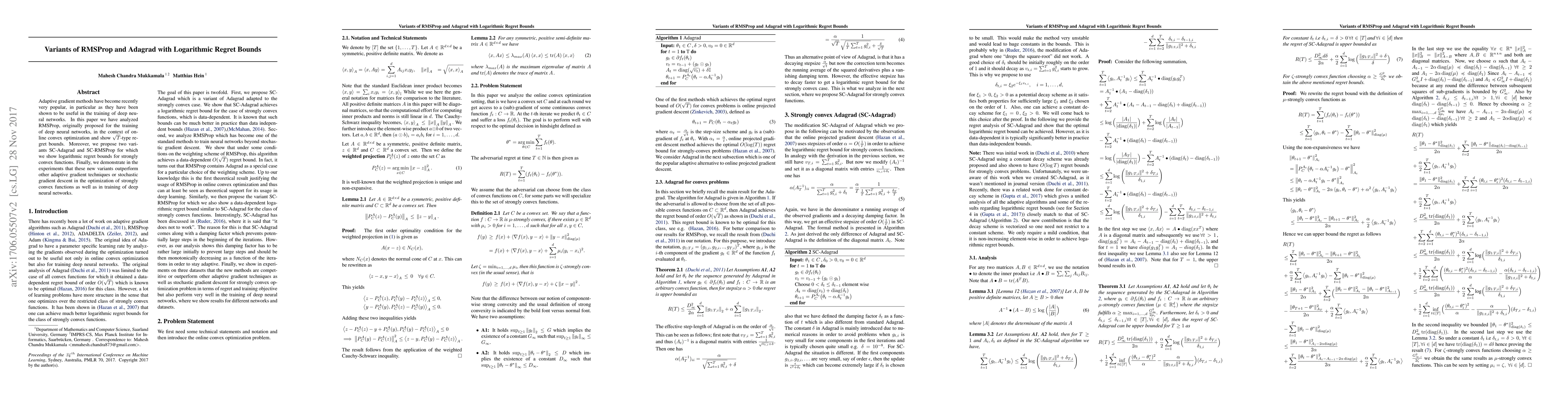 Adaptive gradient methods have become recently very popular, in particular as they have been shown to be useful in the training of deep neural networks. In this paper we have analyzed RMSProp, originally proposed for the training of deep neural networks, in the context of online convex optimization and show $\sqrt{T}$-type regret bounds. Moreover, we propose two variants SC-Adagrad and SC-RMSProp for which we show logarithmic regret bounds for strongly convex functions. Finally, we demonstrate in the experiments that these new variants outperform other adaptive gradient techniques or stochastic gradient descent in the optimization of strongly convex functions as well as in training of deep neural networks.