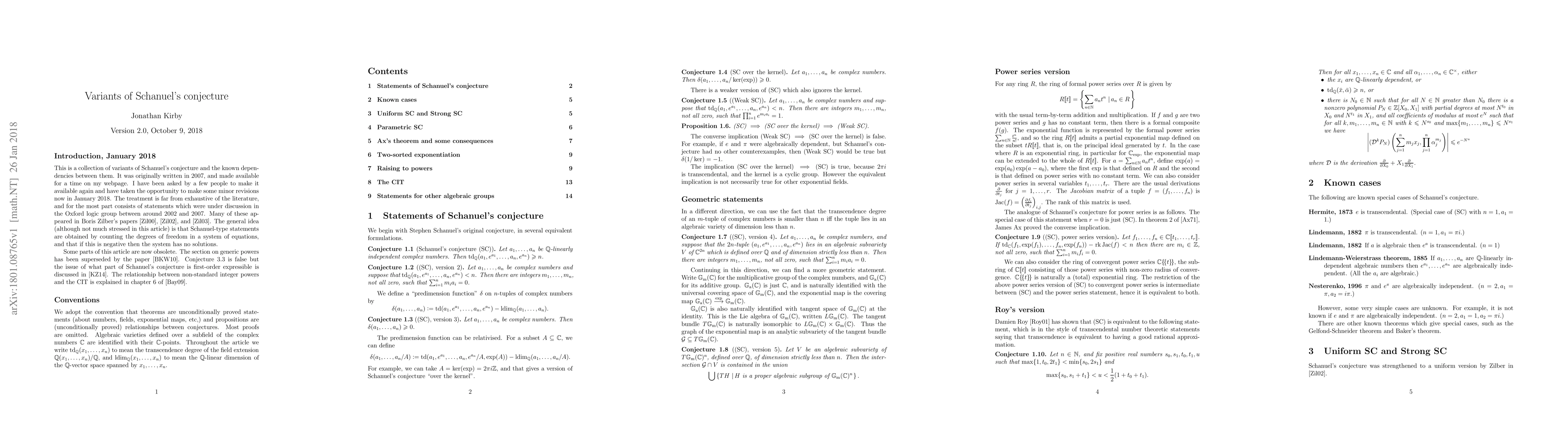 This is a collection of variants of Schanuel's conjecture and the known dependencies between them. It was originally written in 2007, and made available for a time on my webpage. I have been asked by a few people to make it available again and have taken the opportunity to make some minor revisions now in January 2018. The treatment is far from exhaustive of the literature, and for the most part consists of statements which were under discussion in the Oxford logic group between around 2002 and 2007.
