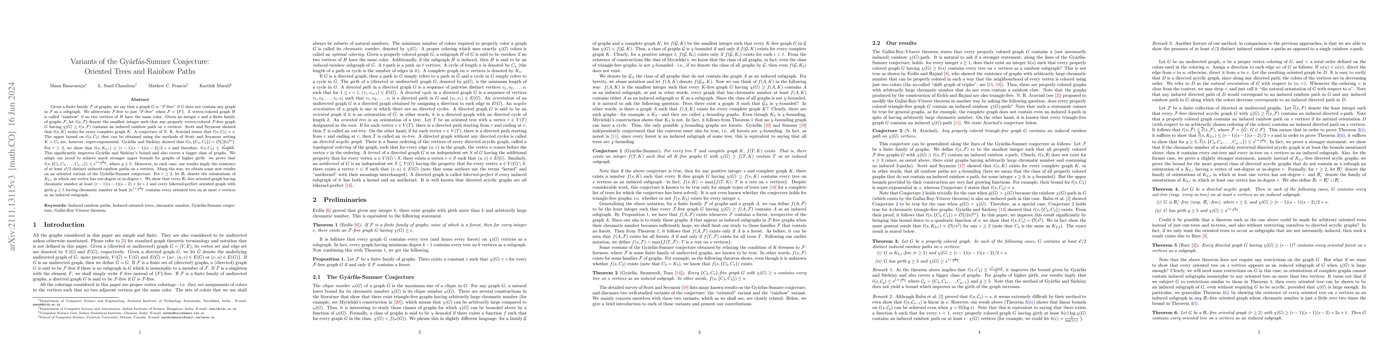 Given a finite family $\mathcal{F}$ of graphs, we say that a graph $G$ is "$\mathcal{F}$-free" if $G$ does not contain any graph in $\mathcal{F}$ as a subgraph. A vertex-colored graph $H$ is called "rainbow" if no two vertices of $H$ have the same color. Given an integer $s$ and a finite family of graphs $\mathcal{F}$, let $\ell(s,\mathcal{F})$ denote the smallest integer such that any properly vertex-colored $\mathcal{F}$-free graph $G$ having $\chi(G)\geq\ell(s,\mathcal{F})$ contains an induced rainbow path on $s$ vertices. Scott and Seymour showed that $\ell(s,K)$ exists for every complete graph $K$. A conjecture of N. R. Aravind states that $\ell(s,C_3)=s$. The upper bound on $\ell(s,C_3)$ that can be obtained using the methods of Scott and Seymour setting $K=C_3$ are, however, super-exponential. Gy\'arf\'as and S\'ark\"ozy showed that $\ell(s,\{C_3,C_4\})=\mathcal{O}\big((2s)^{2s}\big)$. For $r\geq 2$, we show that $\ell(s,K_{2,r})\leq (r-1)(s-1)(s-2)/2+s$ and therefore, $\ell(s,C_4)\leq\frac{s^2-s+2}{2}$. This significantly improves Gy\'arf\'as and S\'ark\"ozy's bound and also covers a bigger class of graphs. We adapt our proof to achieve much stronger upper bounds for graphs of higher girth: we prove that $\ell(s,\{C_3,C_4,\ldots,C_{g-1}\})\leq s^{1+\frac{4}{g-4}}$, where $g\geq 5$. Moreover, in each case, our results imply the existence of at least $s!/2$ distinct induced rainbow paths on $s$ vertices. Along the way, we obtain some results on related problems on oriented graphs. For $r\geq 2$, let $\mathcal{B}_r$ denote the orientations of $K_{2,r}$ in which one vertex has out-degree or in-degree $r$. We show that every $\mathcal{B}_r$-free oriented graph $G$ having $\chi(G)\geq (r-1)(s-1)(s-2)+2s+1$ and every bikernel-perfect oriented graph $G$ with girth $g\geq 5$ having $\chi(G)\geq 2s^{1+\frac{4}{g-4}}$ contains every $s$ vertex oriented tree as an induced subgraph.