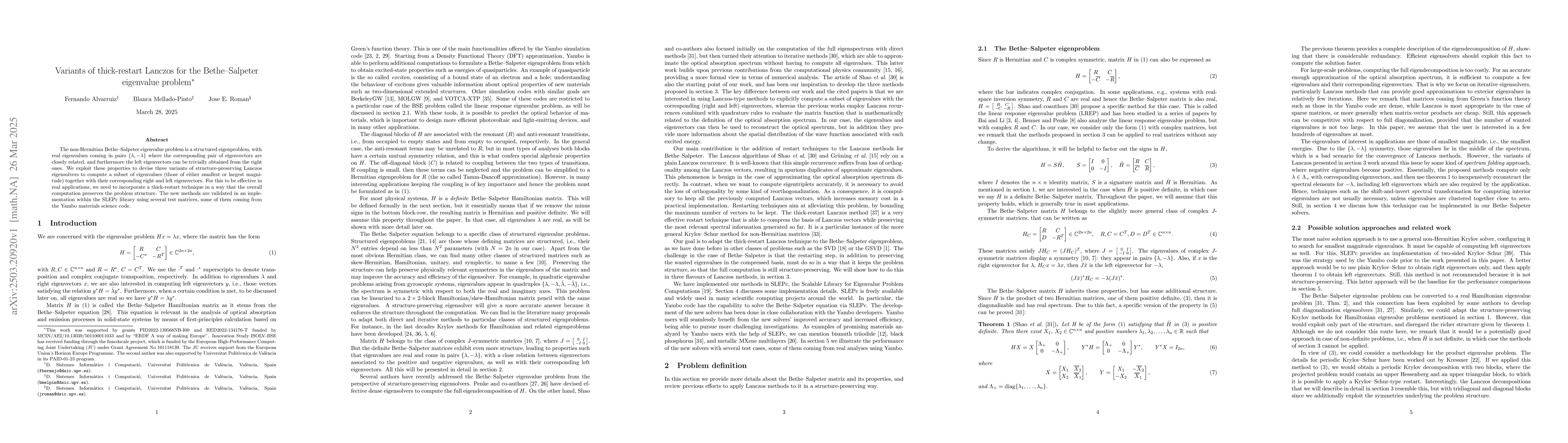 The research presents three variants of structure-preserving Lanczos eigensolvers for the Bethe-Salpeter eigenvalue problem, exploiting its structured nature with real eigenvalues appearing in pairs with closely related eigenvectors. The methods incorporate a thick-restart technique to maintain problem structure during computation.