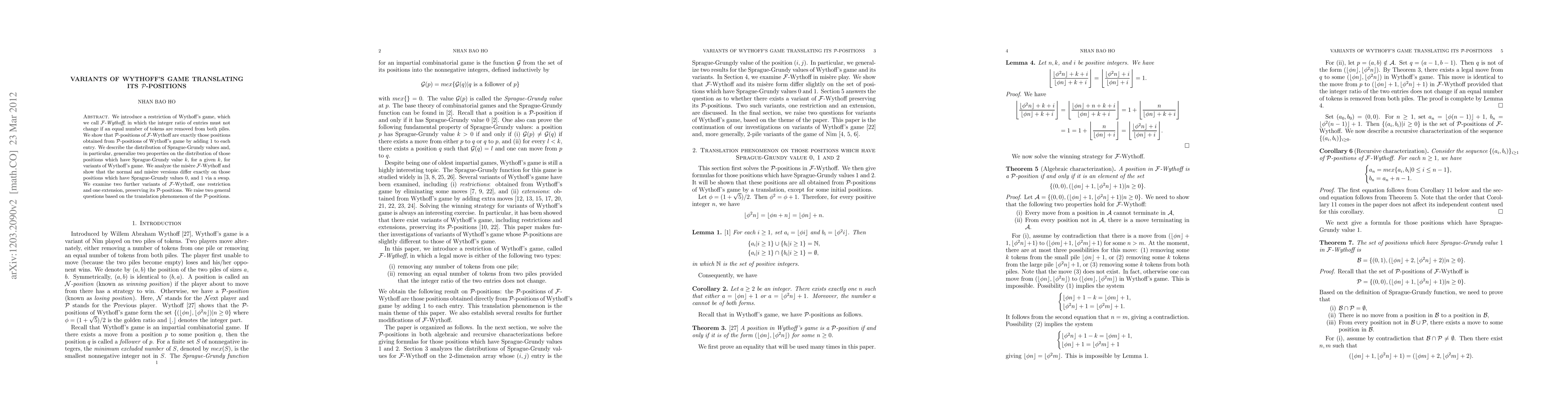 We introduce a restriction of Wythoff's game, which we call F-Wythoff, in which the integer ratio of entries must not change if an equal number of tokens are removed from both piles. We show that P-positions of F-Wythoff are exactly those positions obtained from P-positions of Wythoff's game by adding 1 to each entry. We describe the distribution of Sprague-Grundy values and, in particular, generalize two properties on the distribution of those positions which have Sprague-Grundy value k, for a given k, for variants of Wythoff's game. We analyze the misere F-Wythoff and show that the normal and misere versions differ exactly on those positions which have Sprague-Grundy values 0, and 1 via a swap. We examine two further variants of F-Wythoff, one restriction and one extension, preserving its P-positions. We raise two general questions based on the translation phenomenon of the P-positions.