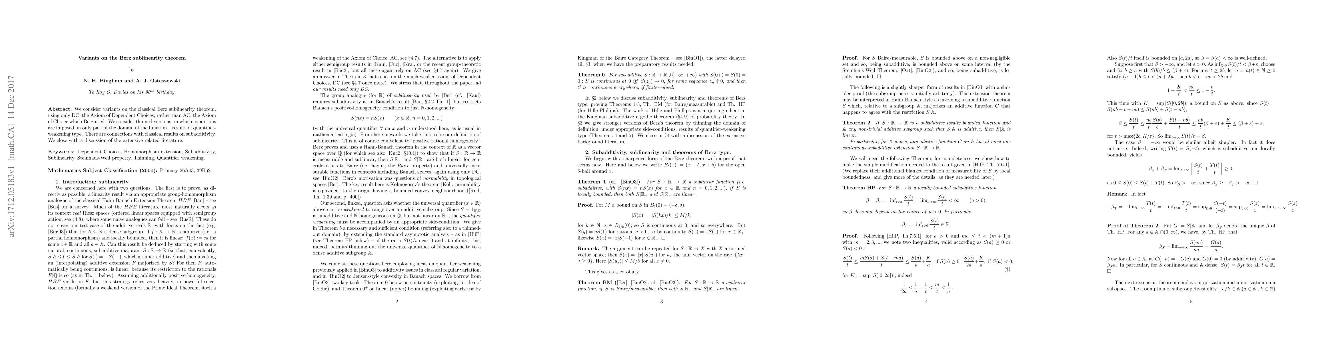 This paper explores variants of Berz's sublinearity theorem using only DC (Axiom of Dependent Choices) instead of AC (Axiom of Choice), focusing on results related to subadditivity and connections to classical literature.