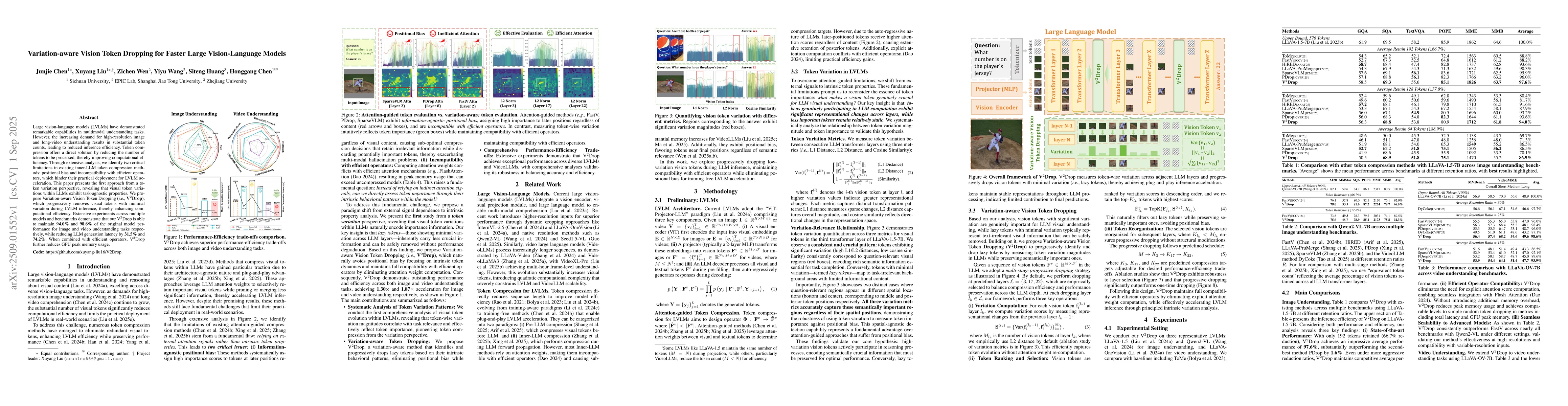Large vision-language models (LVLMs) have demonstrated remarkable capabilities in multimodal understanding tasks. However, the increasing demand for high-resolution image and long-video understanding results in substantial token counts, leading to reduced inference efficiency. Token compression offers a direct solution by reducing the number of tokens to be processed, thereby improving computational efficiency. Through extensive analysis, we identify two critical limitations in existing inner-LLM token compression methods: positional bias and incompatibility with efficient operators, which hinder their practical deployment for LVLM acceleration. This paper presents the first approach from a token variation perspective, revealing that visual token variations within LLMs exhibit task-agnostic properties. We propose Variation-aware Vision Token Dropping (\textit{i.e.}, \textbf{V$^2$Drop}), which progressively removes visual tokens with minimal variation during LVLM inference, thereby enhancing computational efficiency. Extensive experiments across multiple models and benchmarks demonstrate that our V$^2$Drop is able to maintain \textbf{94.0\%} and \textbf{98.6\%} of the original model performance for image and video understanding tasks respectively, while reducing LLM generation latency by \textbf{31.5\%} and \textbf{74.2\%}. When combined with efficient operators, V$^2$Drop further reduces GPU peak memory usage.