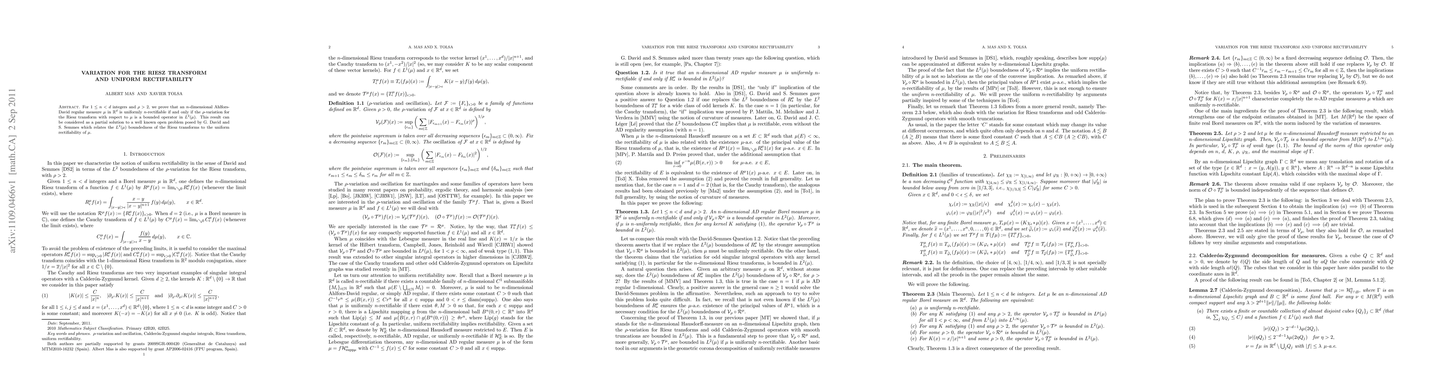 This paper proves that an n-dimensional Ahlfors-David regular measure in R^d is uniformly n-rectifiable if and only if the r-variation for the Riesz transform with respect to M is a bounded operator in L^2(M). This establishes a partial solution to an open problem concerning the relationship between the Riesz transform's L^2(M) boundedness and the uniform rectifiability of M.