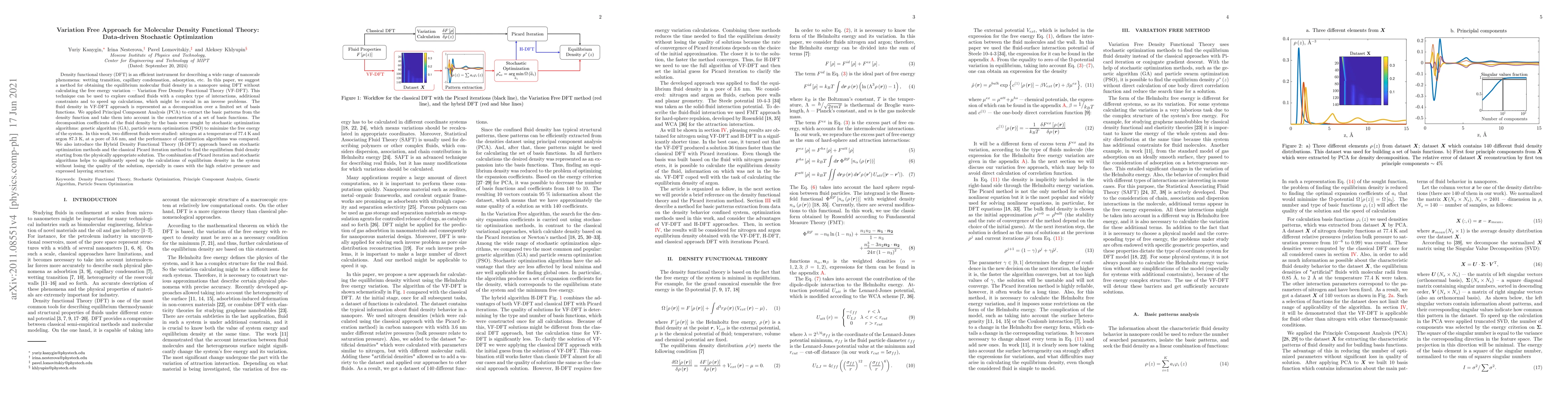 This paper proposes a Variation Free Density Functional Theory (VF-DFT) method to determine equilibrium molecular fluid density in nanopores without calculating free energy variation, using stochastic optimization algorithms like genetic and particle swarm optimization. The approach combines Principal Component Analysis (PCA) and Hybrid Density Functional Theory (H-DFT) to speed up calculations and improve accuracy, especially under high relative pressure conditions.