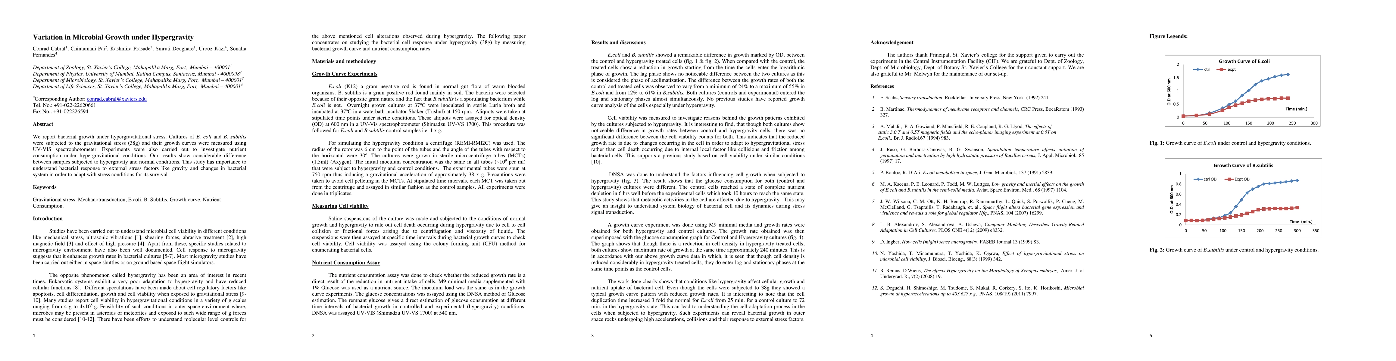 We report bacterial growth under hypergravitational stress. Cultures of E. coli and B. subtilis were subjected to the gravitational stress (38g) and their growth curves were measured using UV-VIS spectrophotometer. Experiments were also carried out to investigate nutrient consumption under hypergravitational conditions. Our results show considerable difference between samples subjected to hypergravity and normal conditions. This study has importance to understand bacterial response to external stress factors like gravity and changes in bacterial system in order to adapt with stress conditions for its survival.