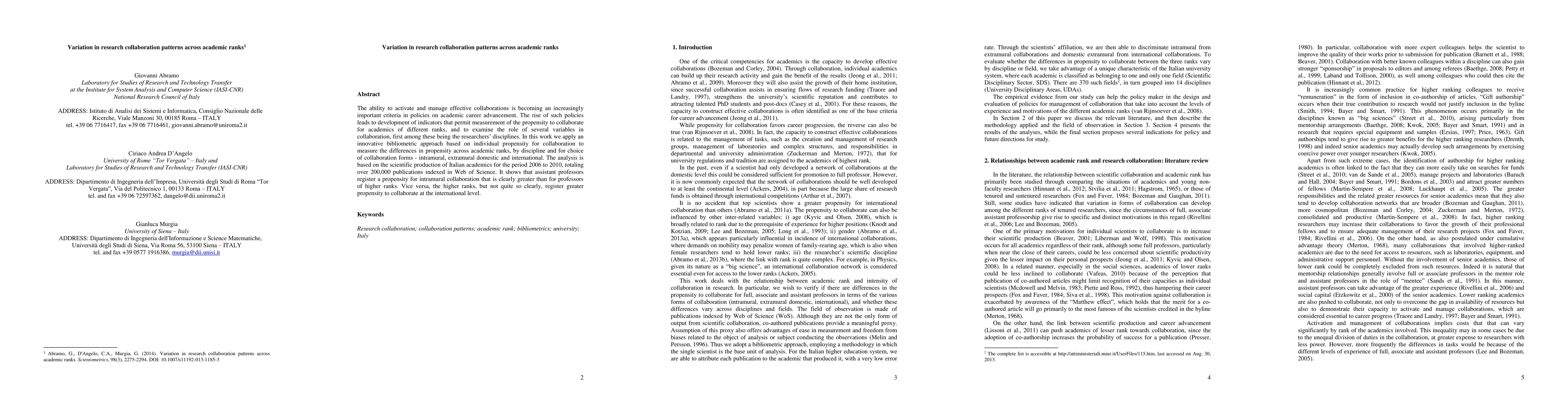 This study uses bibliometric analysis to measure collaboration patterns across academic ranks in Italy from 2006 to 2010, revealing that assistant professors favor intramural collaboration while higher-ranked professors show a greater propensity for international collaboration.