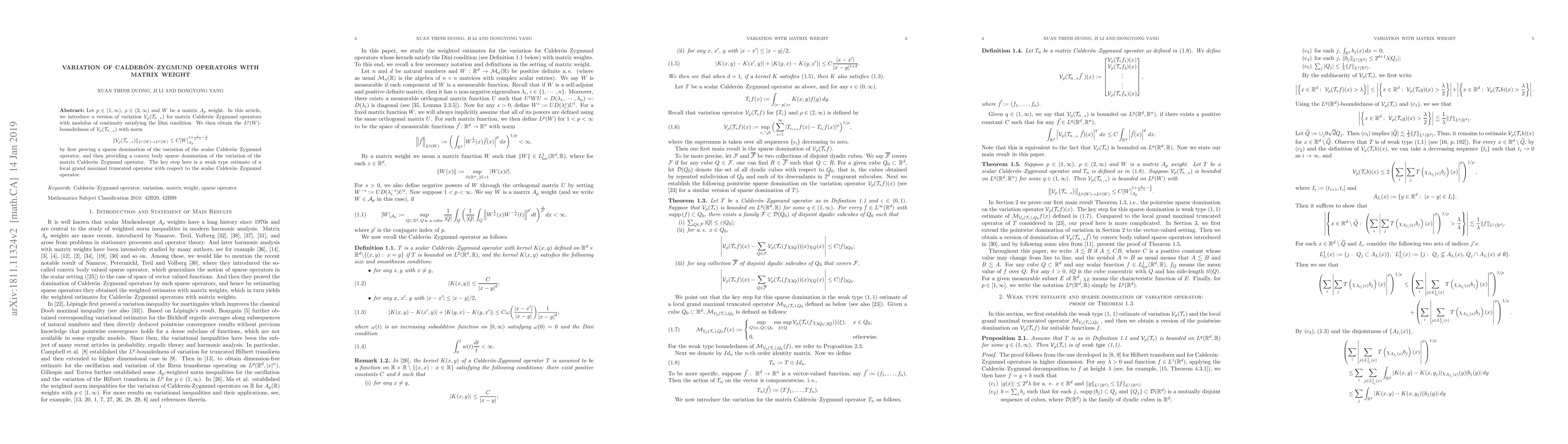 This paper investigates the $L^p(W)$-boundedness of a variation of matrix Calderón-Zygmund operators with a matrix $A_p$ weight, establishing a norm bound via sparse domination techniques. The key result involves a weak type estimate for a local grand maximal truncated operator.