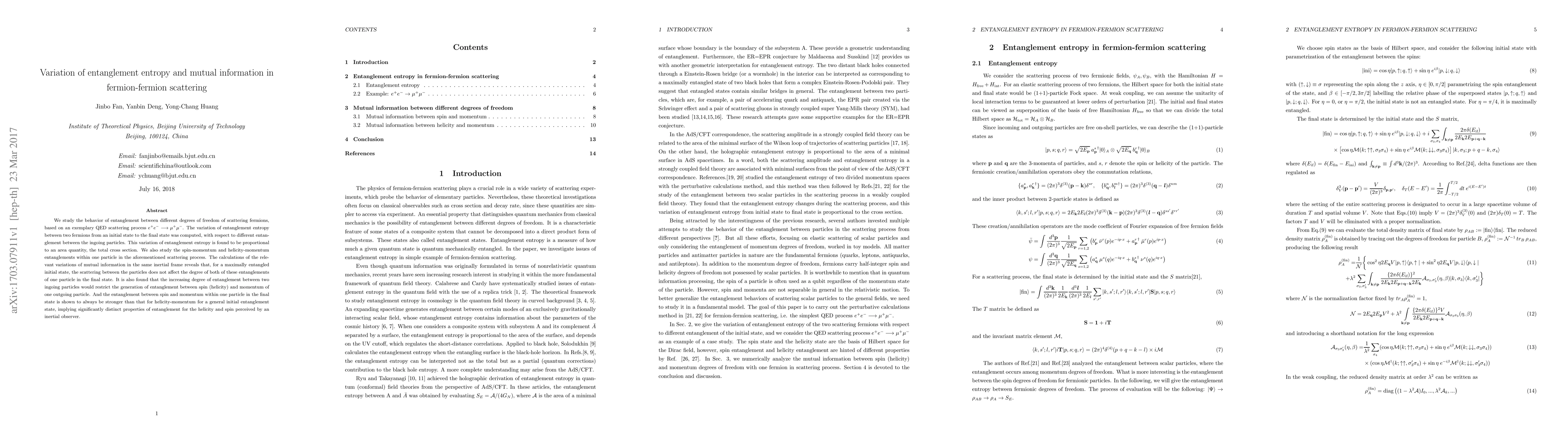 We study the behavior of entanglement between different degrees of freedom of scattering fermions, based on an exemplary QED scattering process $e^+e^-\longrightarrow\mu^+\mu^-$. The variation of entanglement entropy between two fermions from an initial state to the final state was computed, with respect to different entanglement between the ingoing particles. This variation of entanglement entropy is found to be proportional to an area quantity, the total cross section. We also study the spin-momentum and helicity-momentum entanglements within one particle in the aforementioned scattering process. The calculations of the relevant variations of mutual information in the same inertial frame reveals that, for a maximally entangled initial state, the scattering between the particles does not affect the degree of both of these entanglements of one particle in the final state. It is also found that the increasing degree of entanglement between two ingoing particles would restrict the generation of entanglement between spin (helicity) and momentum of one outgoing particle. And the entanglement between spin and momentum within one particle in the final state is shown to always be stronger than that for helicity-momentum for a general initial entanglement state, implying significantly distinct properties of entanglement for the helicity and spin perceived by an inertial observer.