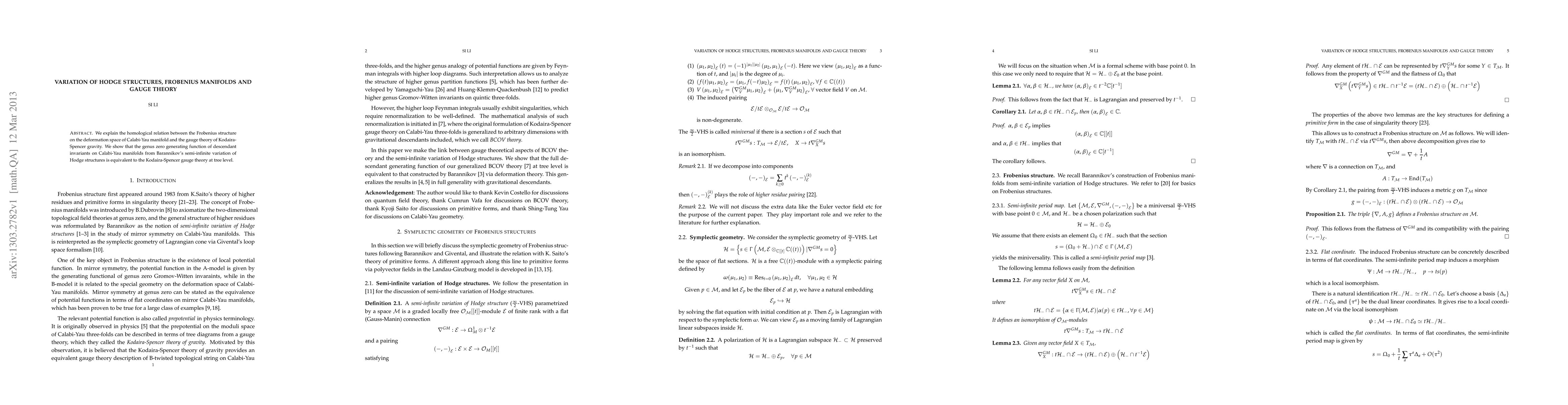 This paper explores the connection between Frobenius manifolds on the deformation space of Calabi-Yau manifolds and gauge theory, demonstrating that Barannikov's variation of Hodge structures aligns with Kodaira-Spencer gravity in gauge theory at the tree level.