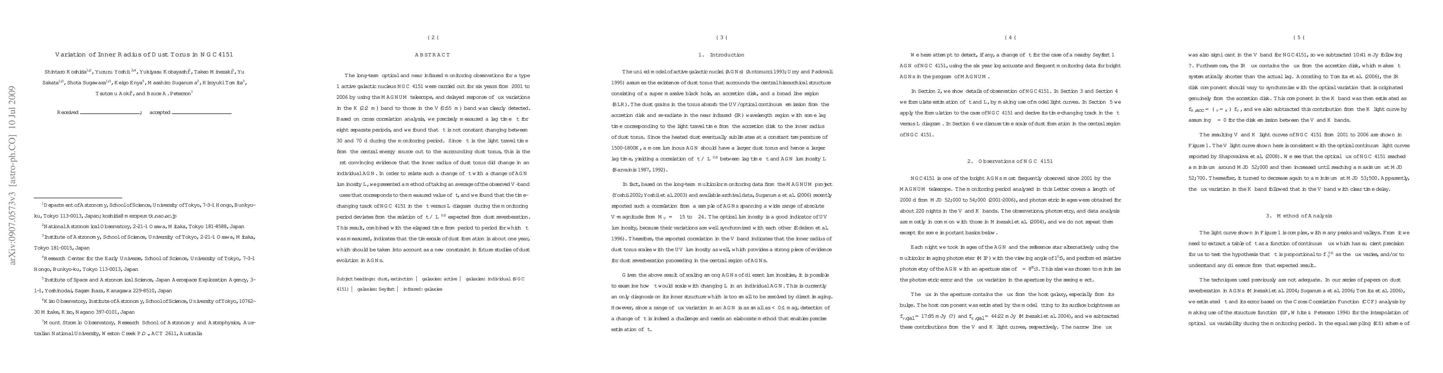 The long-term optical and near infrared monitoring observations for a type 1 act ive galactic nucleus NGC 4151 were carried out for six years from 2001 to 2006 b y using the MAGNUM telescope, and delayed response of flux variations in the $K(2.2\mu m)$ band to those in the $V(0.55\mu m)$ band was clearly detected. Based on cross correlation analysis, we precisely measured a lag time $\Delta t$ for eight separate periods, and we found that $\Delta t$ is not constant changing be tween 30 and 70 days during the monitoring period. Since $\Delta t$ is the ligh t travel time from the central energy source out to the surrounding dust torus, this is the first convincing evidence that the inner radius of dust torus did ch ange in an individual AGN. In order to relate such a change of $\Delta t$ with a change of AGN luminosity $L$, we presented a method of taking an average of th e observed $V$-band fluxes that corresponds to the measured value of $\Delta t$, and we found that the time-changing track of NGC 4151 in the $\Delta t$ versus $L$ diagram during the monitoring period deviates from the relation of $\Delta t \propto L^{0.5}$ expected from dust reverberation. This result, combined with t he elapsed time from period to period for which $\Delta t$ was measured, indicat es that the timescale of dust formation is about one year, which should be taken into account as a new constraint in future studies of dust evolution in AGNs.