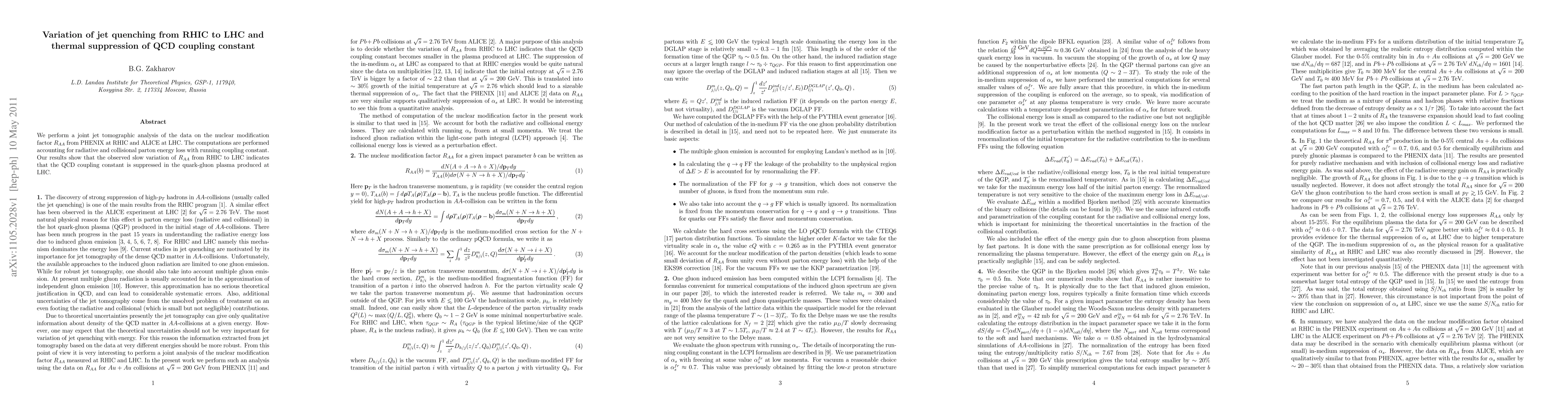 We perform a joint jet tomographic analysis of the data on the nuclear modification factor $R_{AA}$ from PHENIX at RHIC and ALICE at LHC. The computations are performed accounting for radiative and collisional parton energy loss with running coupling constant. Our results show that the observed slow variation of $R_{AA}$ from RHIC to LHC indicates that the QCD coupling constant is suppressed in the quark-gluon plasma produced at LHC.