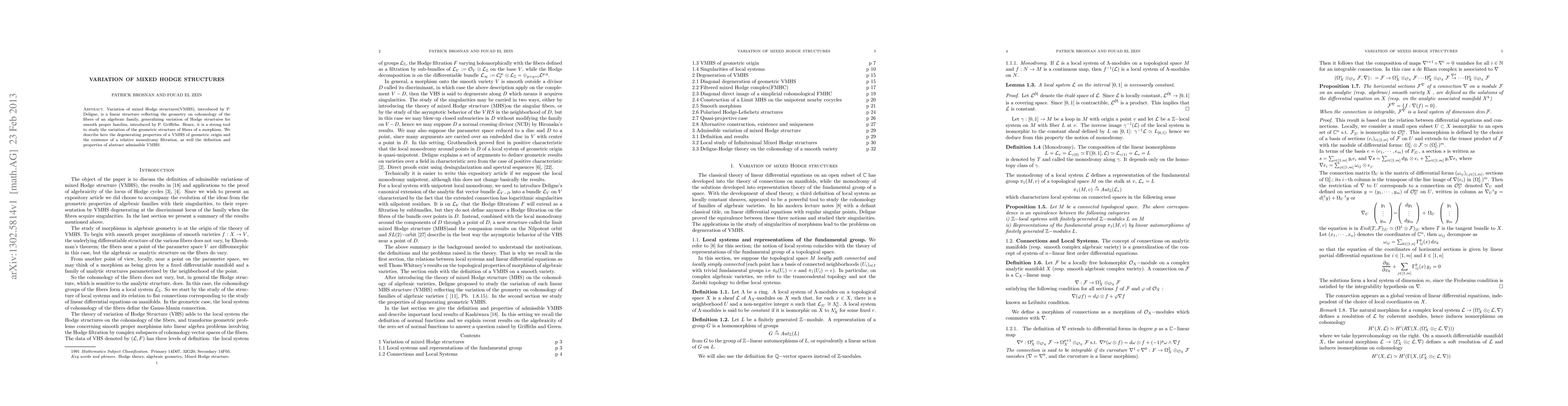 Variation of mixed Hodge structures(VMHS), introduced by P. Deligne, is a linear structure reflecting the geometry on cohomology of the fibers of an algebraic family, generalizing variation of Hodge structures for smooth proper families, introduced by P. Griffiths. Hence, it is a strong tool to study the variation of the geometric structure of fibers of a morphism. We describe here the degenerating properties of a VMHS of geometric origin and the existence of a relative monodromy filtration, as well the definition and properties of abstract admissible VMHS.