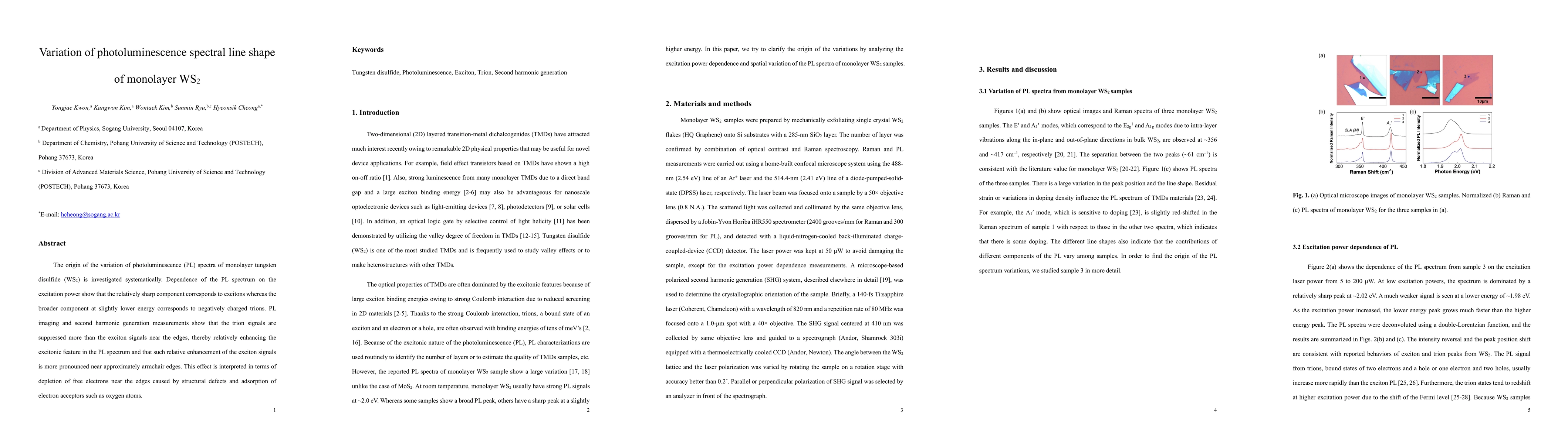 The origin of the variation of photoluminescence (PL) spectra of monolayer tungsten disulfide (WS2) is investigated systematically. Dependence of the PL spectrum on the excitation power show that the relatively sharp component corresponds to excitons whereas the broader component at slightly lower energy corresponds to negatively charged trions. PL imaging and second harmonic generation measurements show that the trion signals are suppressed more than the exciton signals near the edges, thereby relatively enhancing the excitonic feature in the PL spectrum and that such relative enhancement of the exciton signals is more pronounced near approximately armchair edges. This effect is interpreted in terms of depletion of free electrons near the edges caused by structural defects and adsorption of electron acceptors such as oxygen atoms.