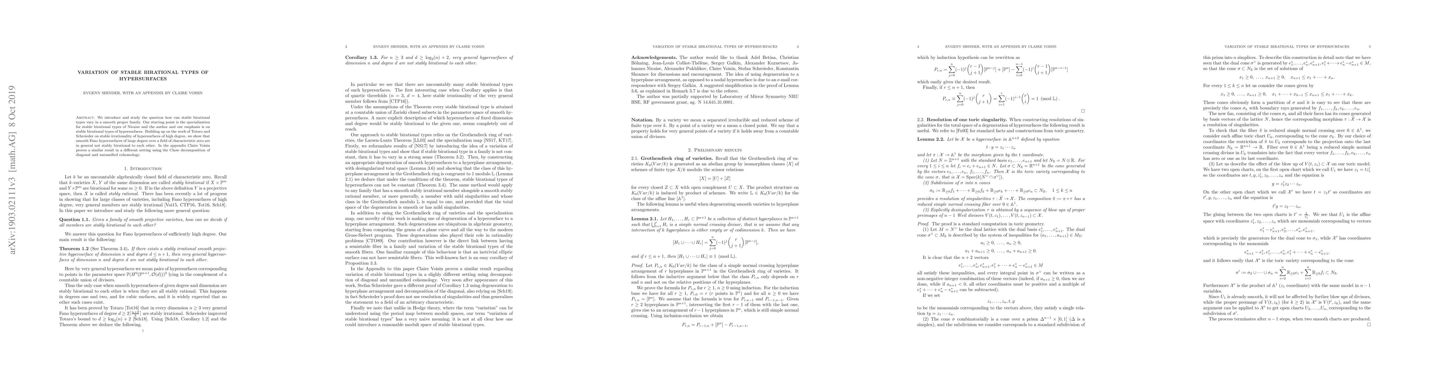 This paper investigates how stable birational types of hypersurfaces can vary within a smooth proper family, demonstrating that smooth Fano hypersurfaces of high degree over a field of characteristic zero generally do not share stable birational types. An appendix by Claire Voisin provides a complementary result using the Chow decomposition in a different context.
