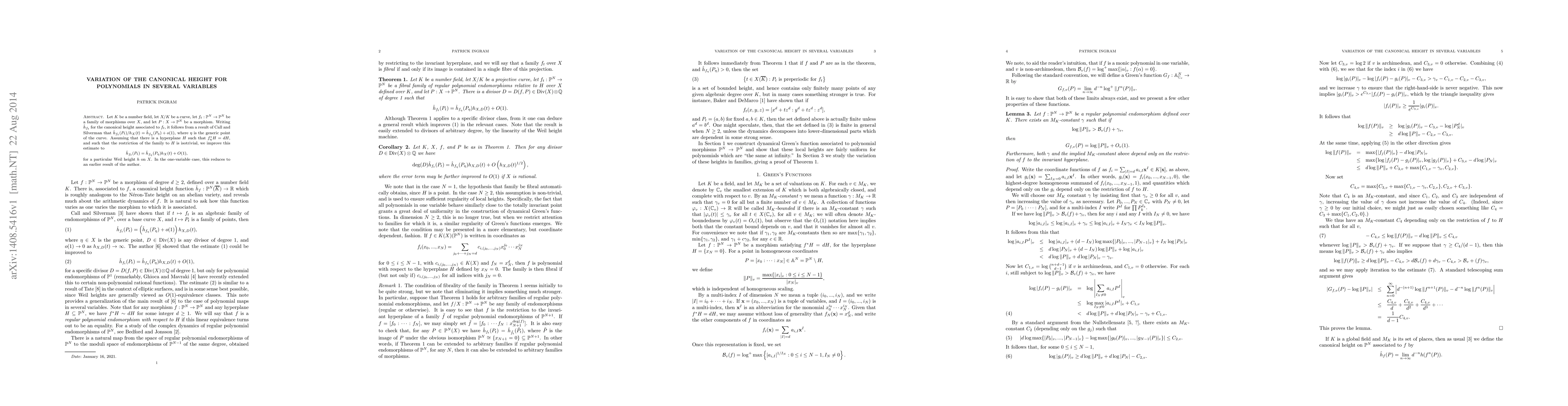 This paper investigates the canonical height for polynomial families in several variables over a number field, showing that when the family has an invariant hyperplane, the canonical height differs from a Weil height by a bounded amount, rather than just a little-o term. This improvement provides a more precise understanding of the height variation.
