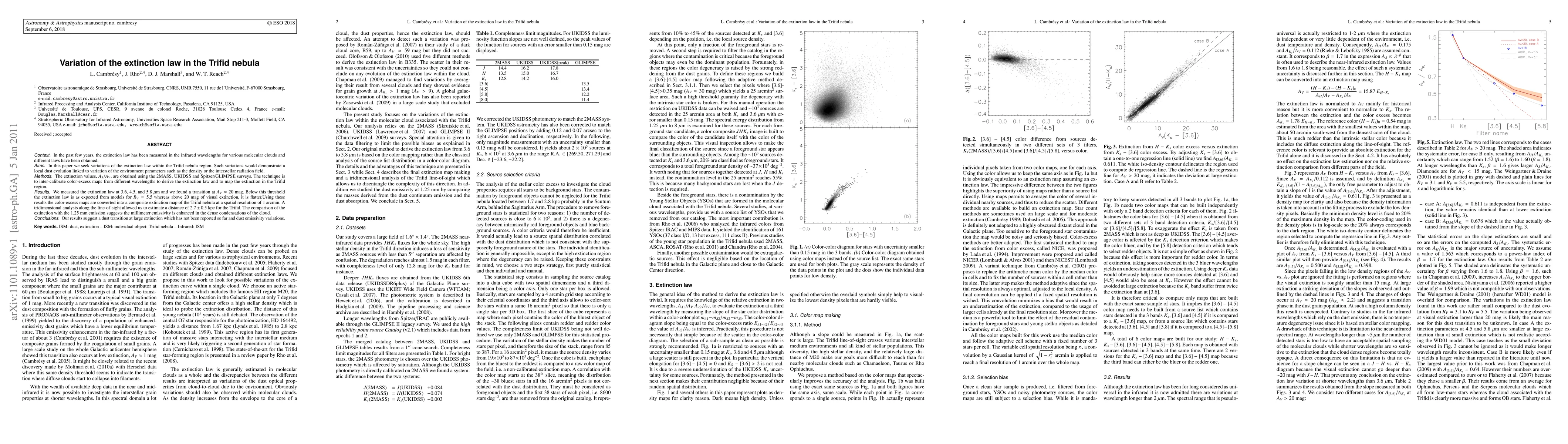 This paper investigates variations in the extinction law within the Trifid nebula, revealing a transition at A_V ~ 20 mag where the extinction law becomes flatter above this threshold. The study uses data from 2MASS, UKIDSS, and Spitzer to create a composite extinction map, suggesting a dust transition and enhanced millimeter emissivity in dense cloud regions.