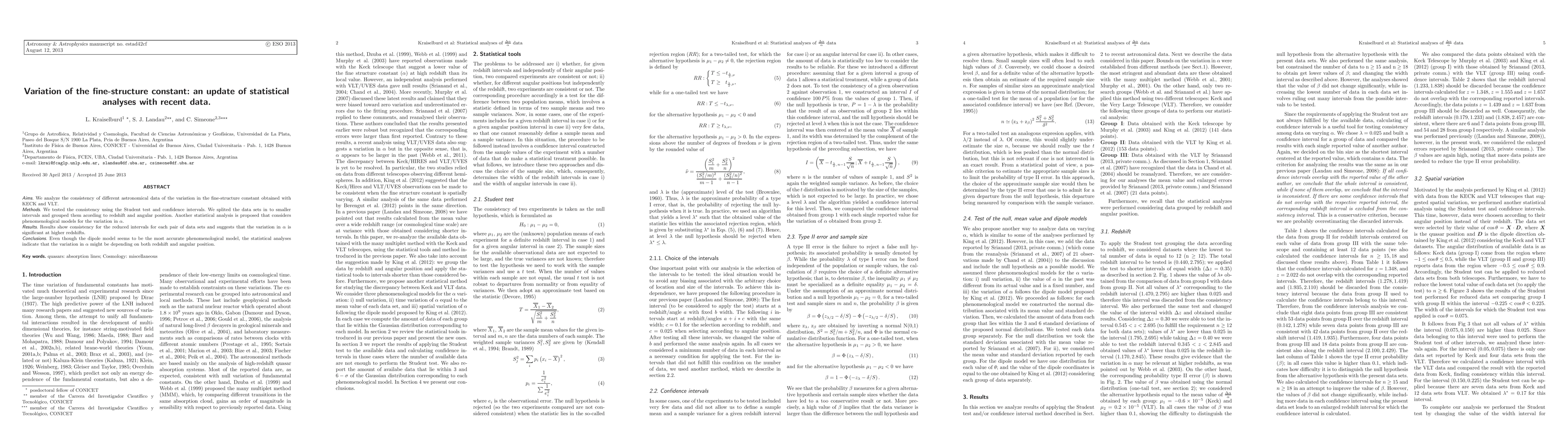 We analyze the consistency of different astronomical data of the variation in the fine-structure constant obtained with KECK and VLT. We tested the consistency using the Student test and confidence intervals. We splited the data sets in to smaller intervals and grouped them acording to redshift and angular position. Another statistical analysis is proposed that considers phenomenological models for the variation in \alpha. Results show consistency for the reduced intervals for each pair of data sets and suggests that the variation in \alpha is significant at higher redshifts. Even though the dipole model seems to be the most accurate phenomenological model, the statistical analyses indicate that the variation in \alpha might be depending on both redshift and angular position.