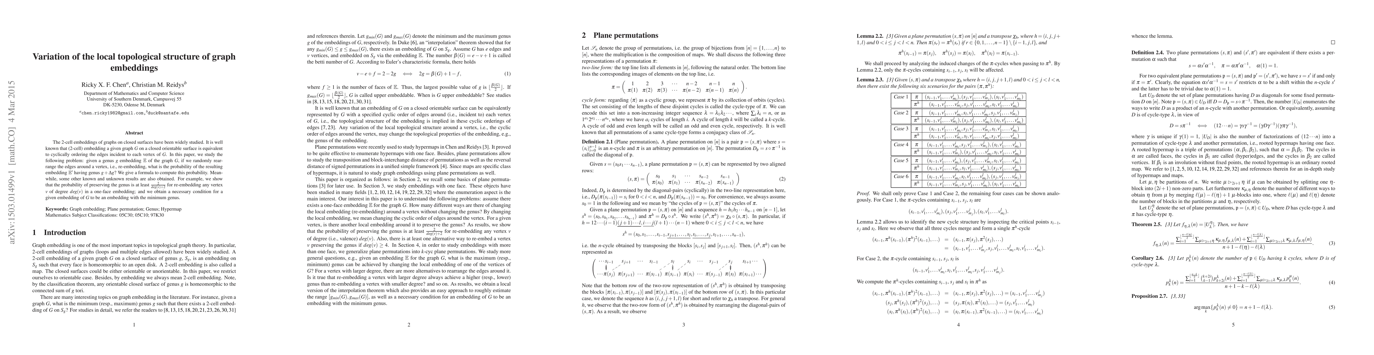This paper presents a formula to calculate the probability of genus change when randomly rearranging edges around a vertex in a graph embedding on a closed surface. It also provides a lower bound for preserving genus and a necessary condition for minimum genus embeddings.