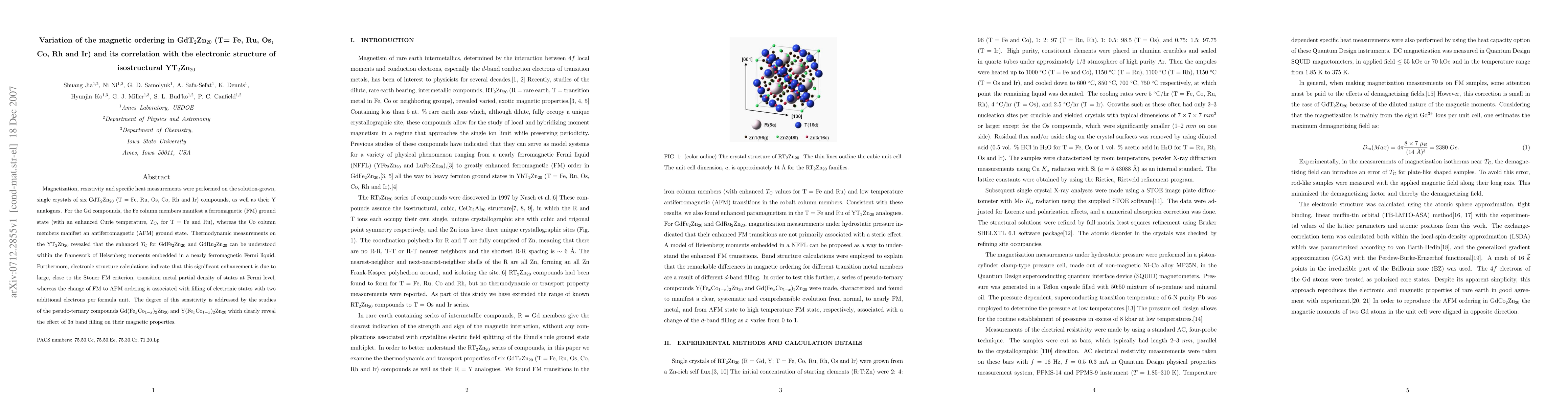 This paper investigates the magnetic ordering variations in GdT$_2$Zn$_{20}$ compounds (T = Fe, Ru, Os, Co, Rh, Ir) and correlates these with the electronic structure of their Y analogues. Ferromagnetic behavior is observed in GdFe$_2$Zn$_{20}$ and GdRu$_2$Zn$_{20}$, while GdCo$_2$Zn$_{20}$ exhibits antiferromagnetic ordering, linked to changes in the electronic density of states and band filling.