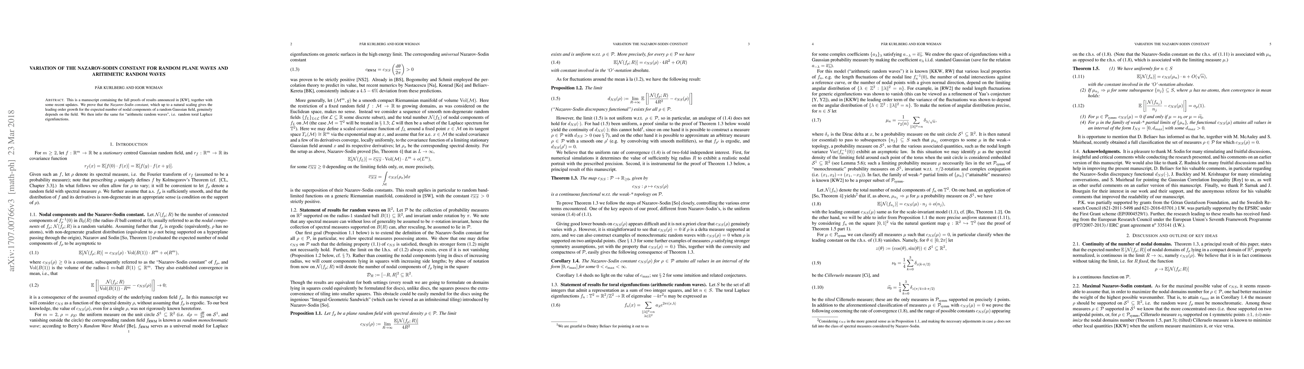 This paper provides proofs for the dependence of the Nazarov-Sodin constant on the underlying random field, showing that it governs the expected number of nodal components. It extends these findings to "arithmetic random waves," specifically random toral Laplace eigenfunctions.