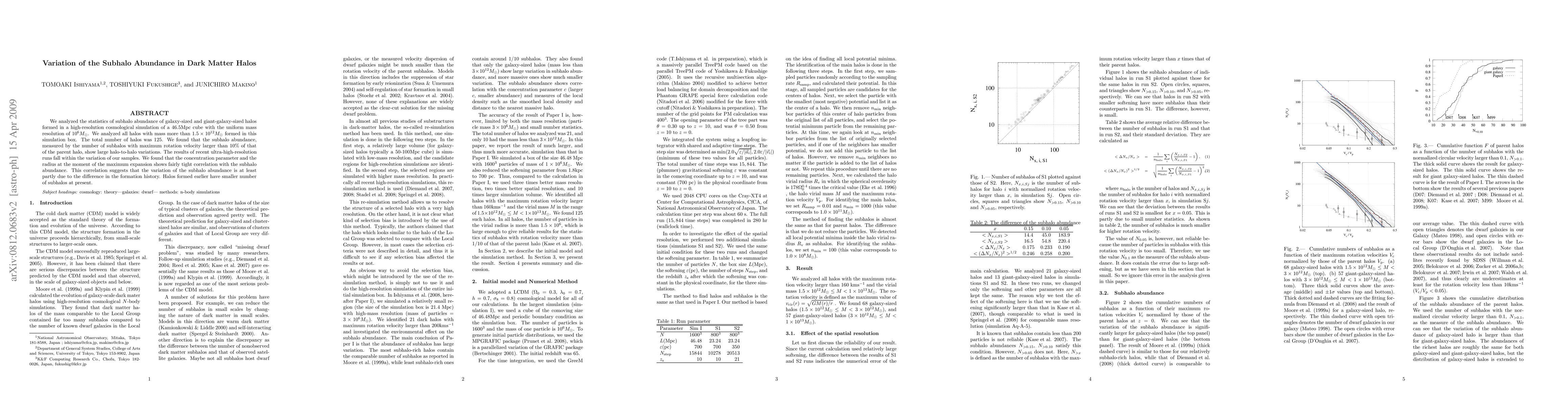 This study investigates the variation in subhalo abundance in galaxy-sized and giant-galaxy-sized dark matter halos from a high-resolution cosmological simulation. It reveals significant halo-to-halo differences in subhalo numbers, with the concentration parameter and the radius at maximum expansion correlating strongly with subhalo abundance, indicating a link to the halo's formation history.