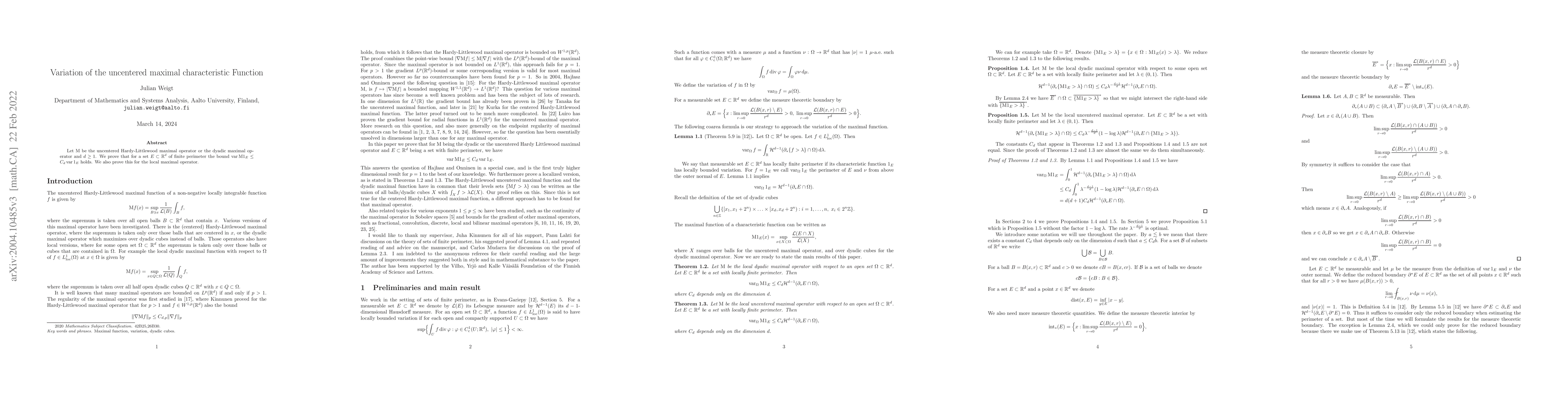 Researchers prove a bound on the variation of the uncentered maximal characteristic function for sets with finite perimeter, relating it to the variation of the indicator function.