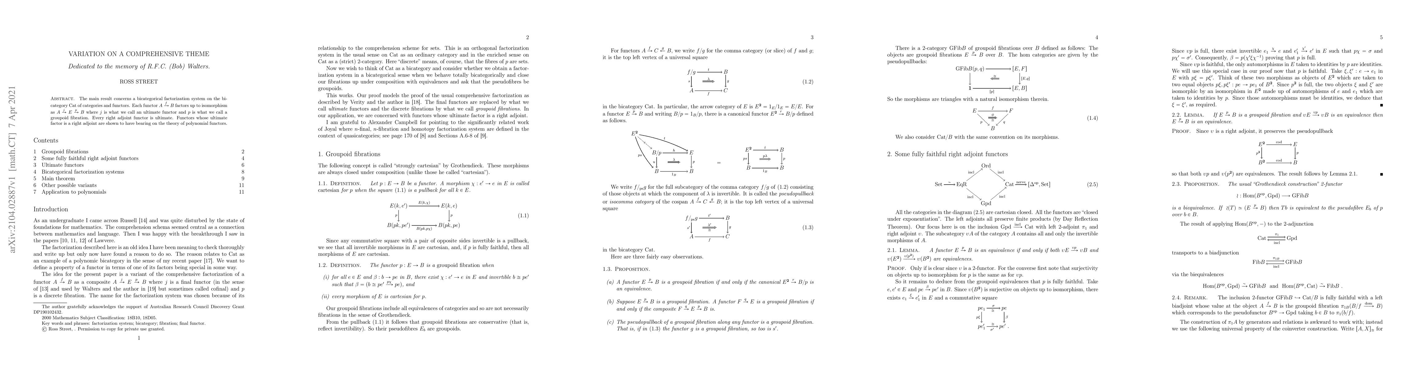 The main result concerns a bicategorical factorization system on the bicategory $\mathrm{Cat}$ of categories and functors. Each functor $A\xra{f} B$ factors up to isomorphism as $A\xra{j}E\xra{p}B$ where $j$ is what we call an ultimate functor and $p$ is what we call a groupoid fibration. Every right adjoint functor is ultimate. Functors whose ultimate factor is a right adjoint are shown to have bearing on the theory of polynomial functors.