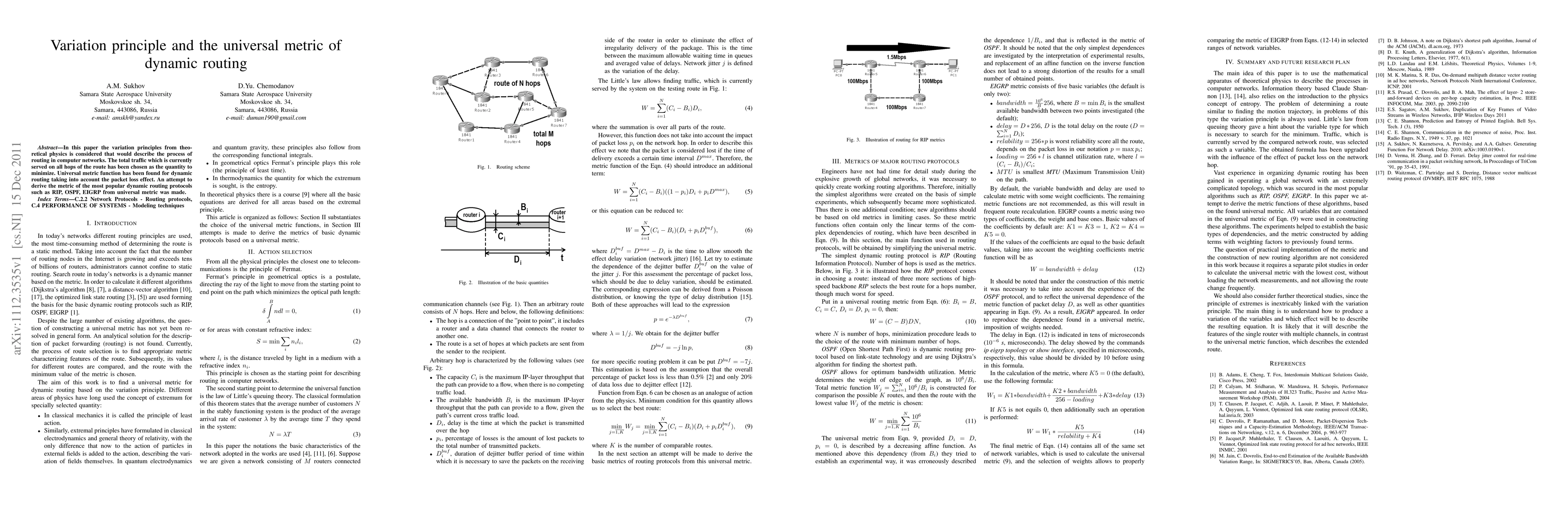 In this paper the variation principles from theoretical physics is considered that would describe the process of routing in computer networks. The total traffic which is currently served on all hops of the route has been chosen as the quantity to minimize. Universal metric function has been found for dynamic routing taking into account the packet loss effect. An attempt to derive the metric of the most popular dynamic routing protocols such as RIP, OSPF, EIGRP from universal metric was made.