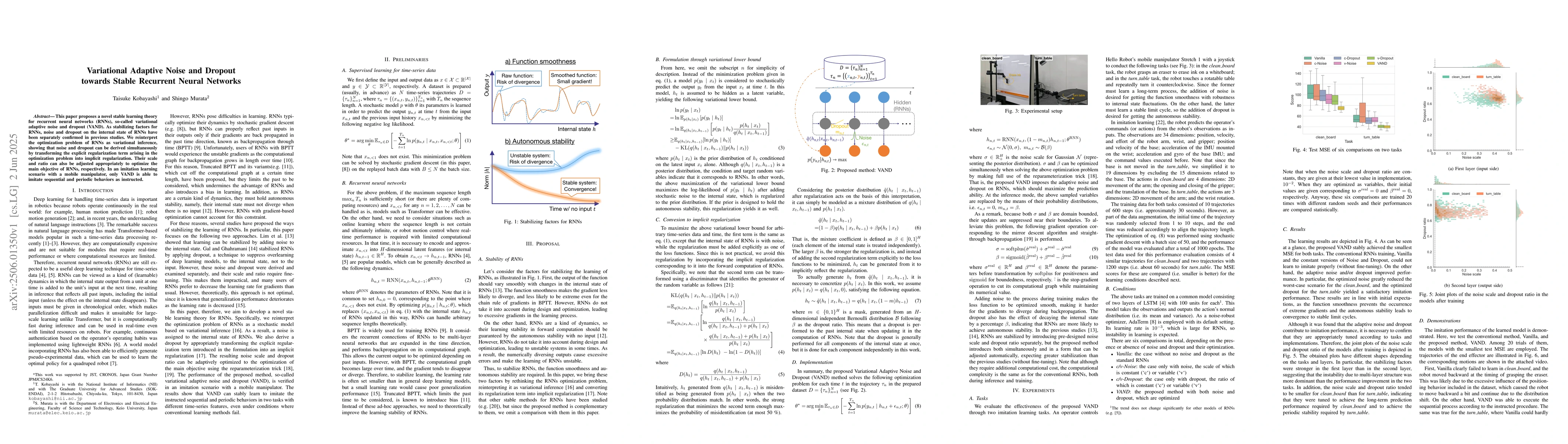 This research introduces Variational Adaptive Noise and Dropout (VAND), a new theory for stabilizing Recurrent Neural Networks (RNNs). VAND unifies noise and dropout techniques, optimizing their scale and ratio for RNN tasks, demonstrating superior performance in imitating sequential and periodic behaviors, as seen in a mobile manipulator imitation learning scenario.
