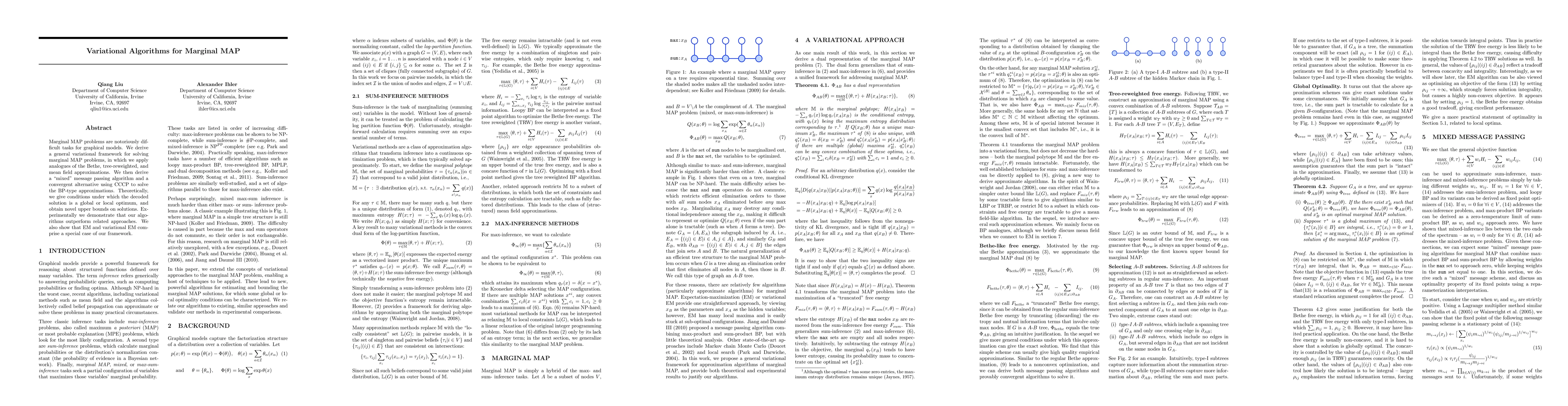 This paper introduces a variational framework for solving marginal MAP problems in graphical models, employing Bethe, tree-reweighted, and mean field approximations. The proposed mixed message passing algorithm and CCCP-based approach are shown to outperform existing methods, with theoretical guarantees on solution optimality and upper bounds.
