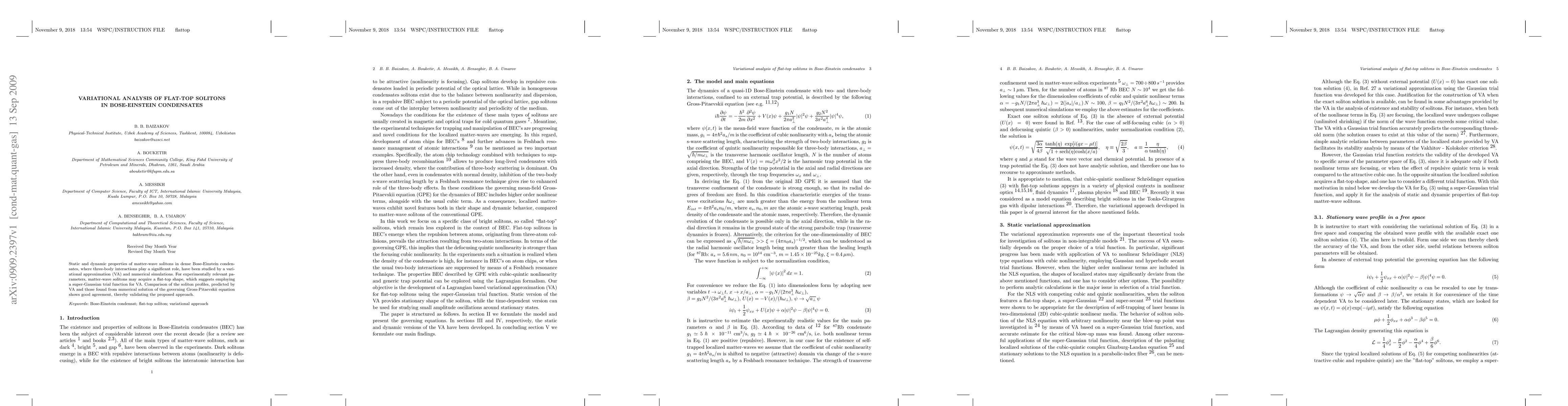 This paper investigates the static and dynamic properties of flat-top solitons in Bose-Einstein condensates using variational approximation and numerical simulations. The study validates the variational approach by comparing its predictions with numerical solutions of the Gross-Pitaevskii equation, showing good agreement.