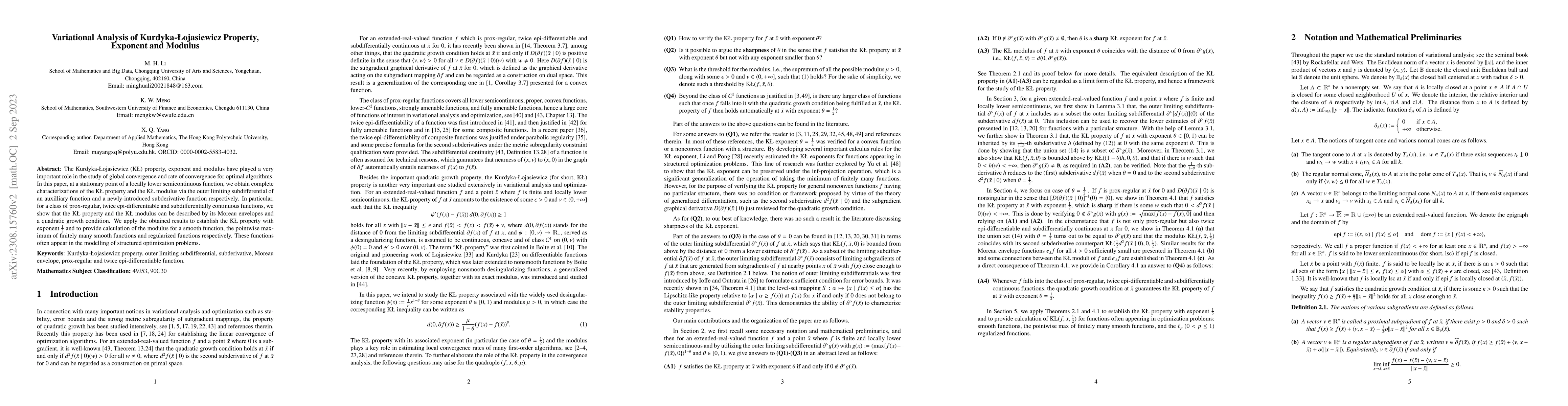 The Kurdyka-{\L}ojasiewicz (K{\L}) property, exponent and modulus have played a very important role in the study of global convergence and rate of convergence for optimal algorithms. In this paper, at a stationary point of a locally lower semicontinuous function, we obtain complete characterizations of the K{\L} property and the K{\L} modulus via the outer limiting subdifferential of an auxilliary function and a newly-introduced subderivative function respectively. In particular, for a class of prox-regular, twice epi-differentiable and subdifferentially continuous functions, we show that the K{\L} property and the K{\L} modulus can be described by its Moreau envelopes and a quadratic growth condition. We apply the obtained results to establish the K{\L} property with exponent $\frac12$ and to provide calculation of the modulus for a smooth function, the pointwise maximum of finitely many smooth functions and regularized functions respectively. These functions often appear in the modelling of structured optimization problems.