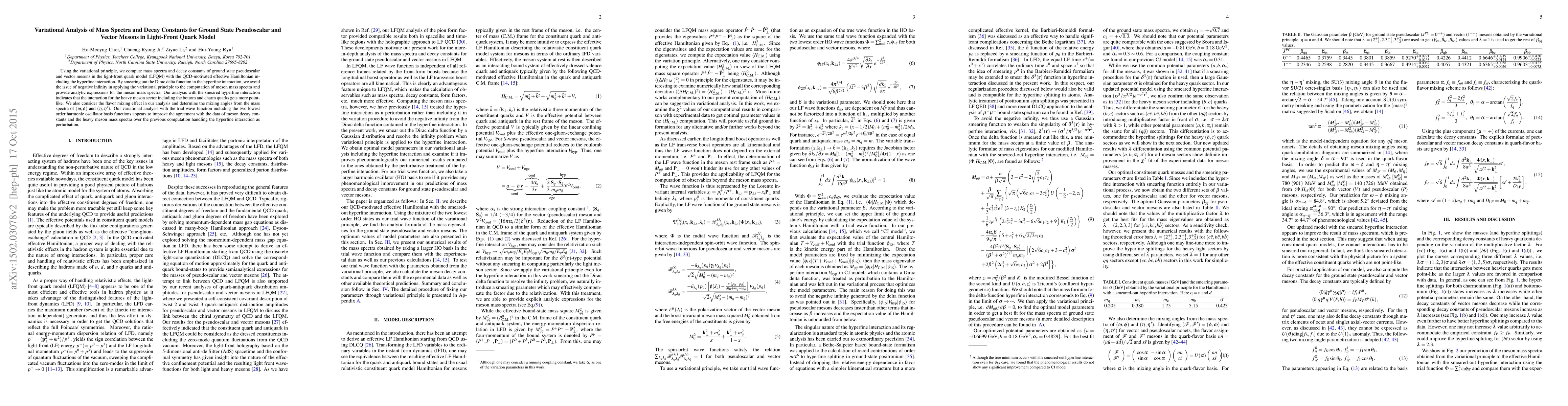 This paper employs variational analysis within the light-front quark model to compute mass spectra and decay constants for ground state pseudoscalar and vector mesons, addressing the hyperfine interaction issue by smearing the Dirac delta function. The study finds improved agreement with experimental data using a trial wave function with harmonic oscillator basis functions.