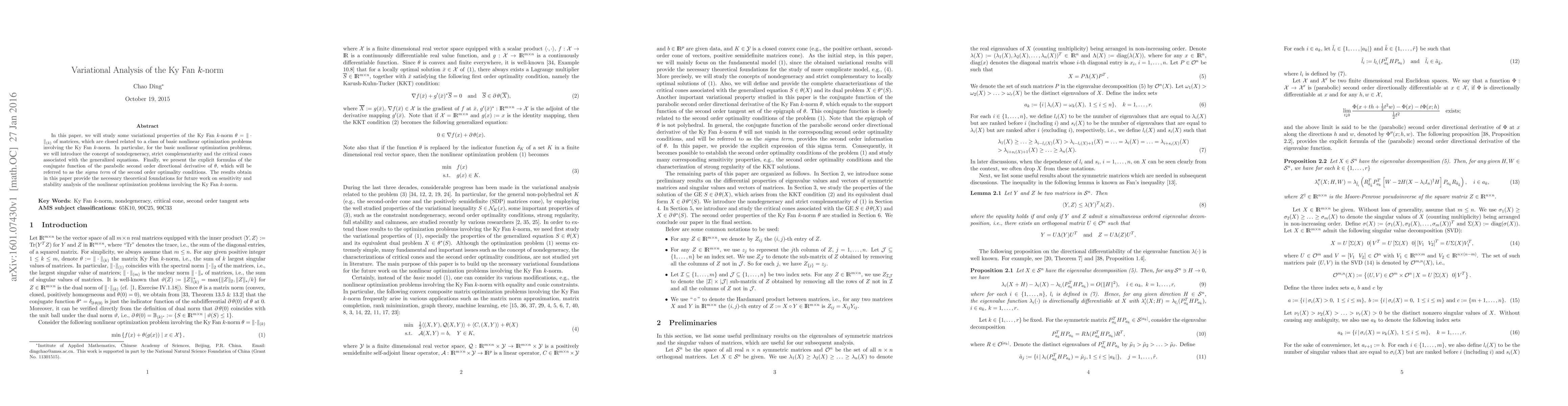 This paper investigates variational properties of the Ky Fan $k$-norm in matrix optimization, introducing concepts like nondegeneracy and strict complementarity. It provides explicit formulas for the sigma term of the second-order optimality conditions, laying theoretical groundwork for future sensitivity and stability analyses in nonlinear optimization.