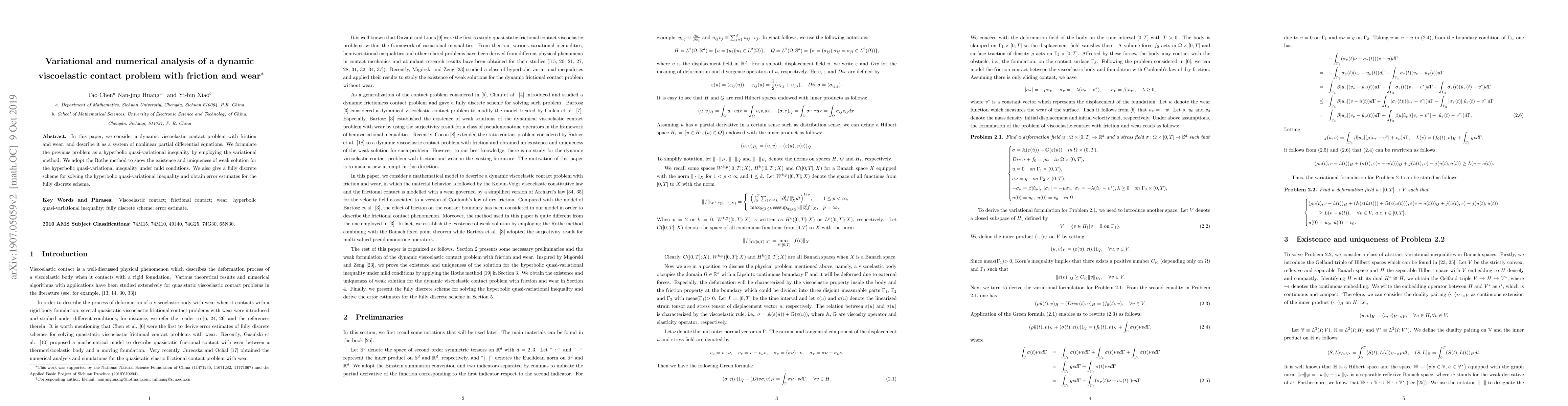 In this paper, we consider a dynamic viscoelastic contact problem with friction and wear, and describe it as a system of nonlinear partial differential equations. We formulate the previous problem as a hyperbolic quasi-variational inequality by employing the variational method. We adopt the Rothe method to show the existence and uniqueness of weak solution for the hyperbolic quasi-variational inequality under mild conditions. We also give a fully discrete scheme for solving the hyperbolic quasi-variational inequality and obtain error estimates for the fully discrete scheme.