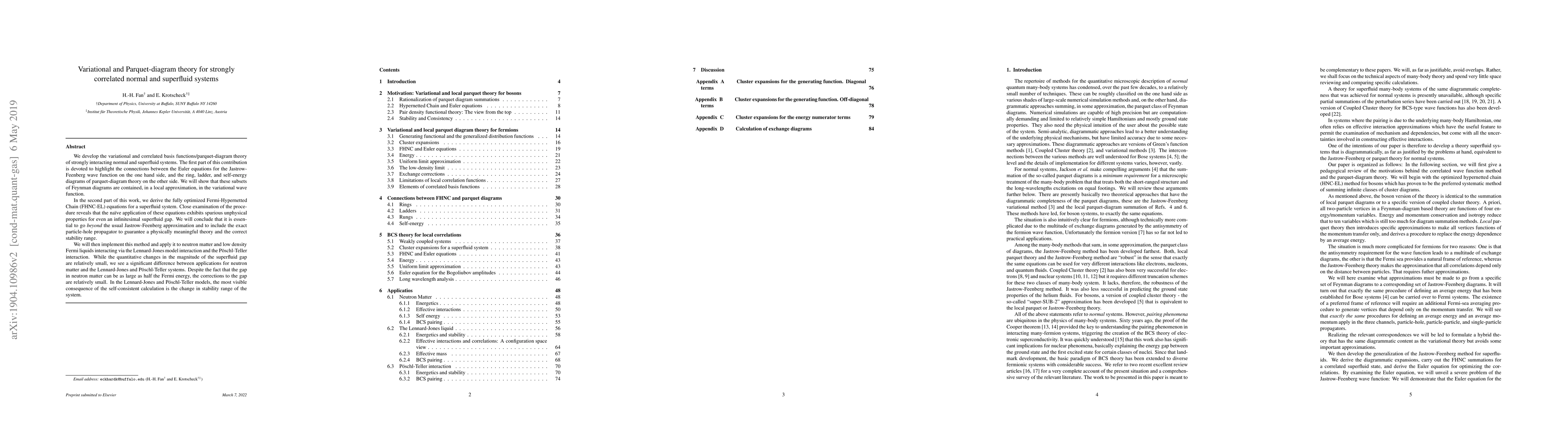 We develop the variational and correlated basis functions/parquet-diagram theory of strongly interacting normal and superfluid systems. The first part of this contribution is devoted to highlight the connections between the Euler equations for the Jastrow-Feenberg wave function on the one hand side, and the ring, ladder, and self-energy diagrams of parquet-diagram theory on the other side. We will show that these subsets of Feynman diagrams are contained, in a local approximation, in the variational wave function. In the second part of this work, we derive the fully optimized Fermi-Hypernetted Chain (FHNC-EL) equations for a superfluid system. Close examination of the procedure reveals that the na\"ive application of these equations exhibits spurious unphysical properties for even an infinitesimal superfluid gap. We will conclude that it is essential to go {\em beyond\/} the usual Jastrow-Feenberg approximation and to include the exact particle-hole propagator to guarantee a physically meaningful theory and the correct stability range. We will then implement this method and apply it to neutron matter and low density Fermi liquids interacting via the Lennard-Jones model interaction and the P\"oschl-Teller interaction. While the quantitative changes in the magnitude of the superfluid gap are relatively small, we see a significant difference between applications for neutron matter and the Lennard-Jones and P\"oschl-Teller systems. Despite the fact that the gap in neutron matter can be as large as half the Fermi energy, the corrections to the gap are relatively small. In the Lennard-Jones and P\"oschl-Teller models, the most visible consequence of the self-consistent calculation is the change in stability range of the system.