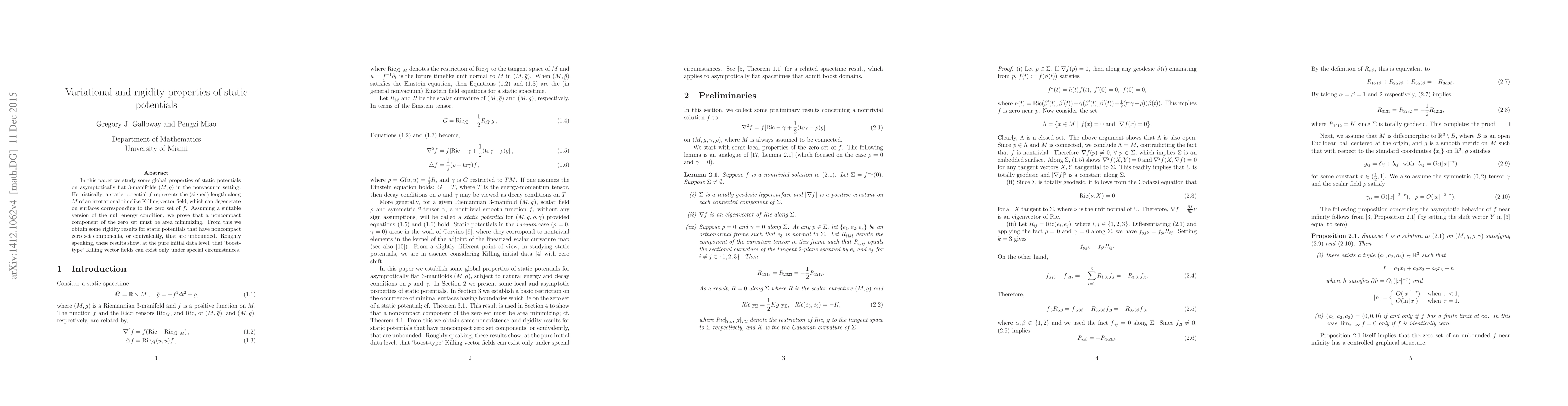 In this paper we study some global properties of static potentials on asymptotically flat $3$-manifolds $(M,g)$ in the nonvacuum setting. Heuristically, a static potential $f$ represents the (signed) length along $M$ of an irrotational timelike Killing vector field, which can degenerate on surfaces corresponding to the zero set of $f$. Assuming a suitable version of the null energy condition, we prove that a noncompact component of the zero set must be area minimizing. From this we obtain some rigidity results for static potentials that have noncompact zero set components, or equivalently, that are unbounded. Roughly speaking, these results show, at the pure initial data level, that `boost-type' Killing vector fields can exist only under special circumstances.