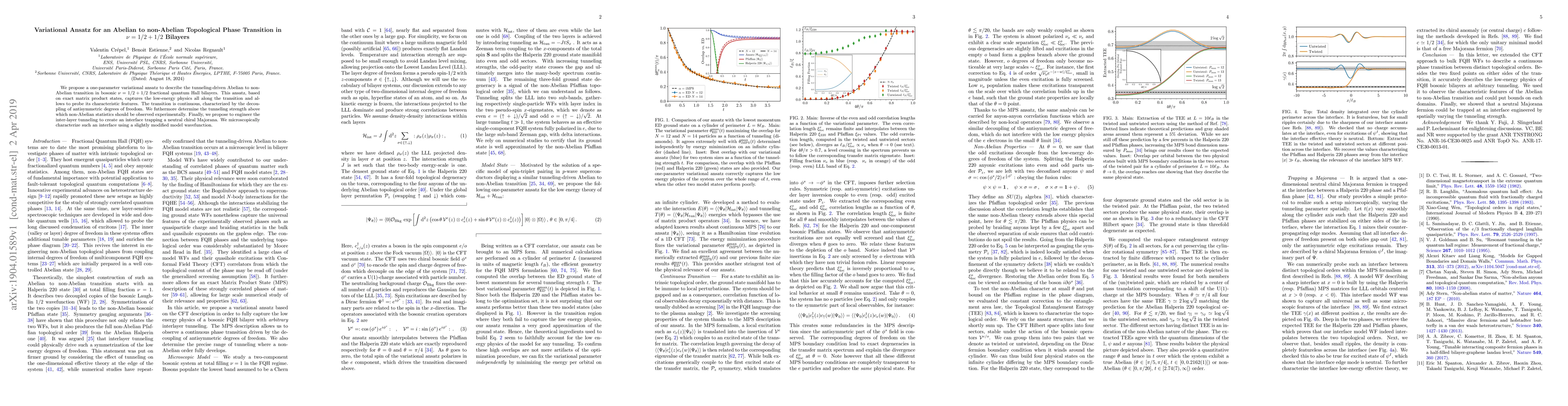 We propose a one-parameter variational ansatz to describe the tunneling-driven Abelian to non-Abelian transition in bosonic $\nu=1/2+1/2$ fractional quantum Hall bilayers. This ansatz, based on exact matrix product states, captures the low-energy physics all along the transition and allows to probe its characteristic features. The transition is continuous, characterized by the decoupling of antisymmetric degrees of freedom. We futhermore determine the tunneling strength above which non-Abelian statistics should be observed experimentally. Finally, we propose to engineer the inter-layer tunneling to create an interface trapping a neutral chiral Majorana. We microscopically characterize such an interface using a slightly modified model wavefunction.