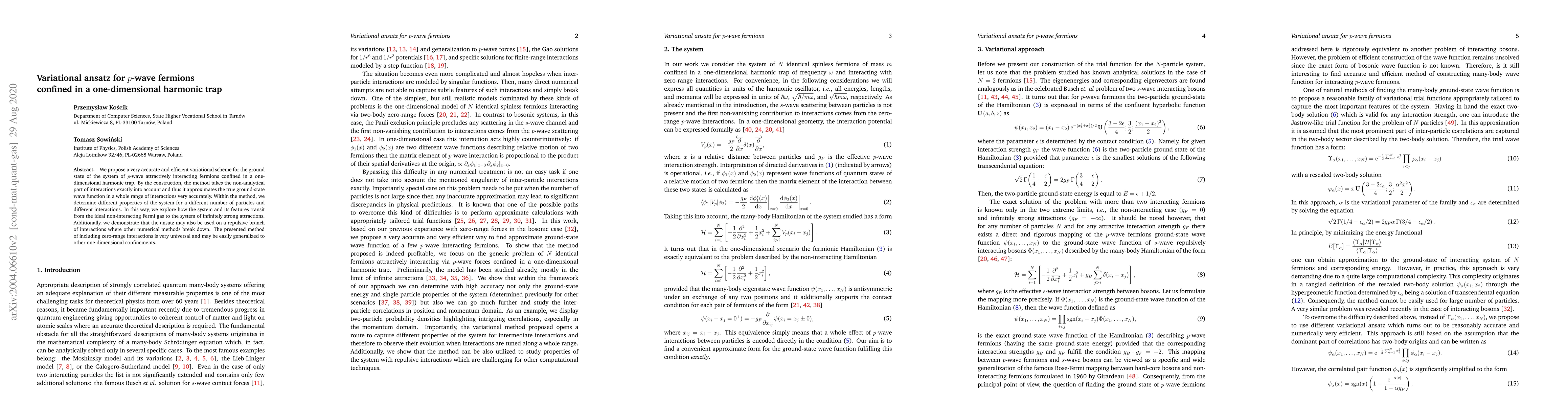 We propose a very accurate and efficient variational scheme for the ground state of the system of $p$-wave attractively interacting fermions confined in a one-dimensional harmonic trap. By the construction, the method takes the non-analytical part of interactions exactly into account and thus it approximates the true ground-state wave function in a whole range of interactions very accurately. Within the method, we determine different properties of the system for a different number of particles and different interactions. In this way, we explore how the system and its features transit from the ideal non-interacting Fermi gas to the system of infinitely strong attractions. Additionally, we demonstrate that the ansatz may also be used on a repulsive branch of interactions where other numerical methods break down. The presented method of including zero-range interactions is very universal and may be easily generalized to other one-dimensional confinements.
