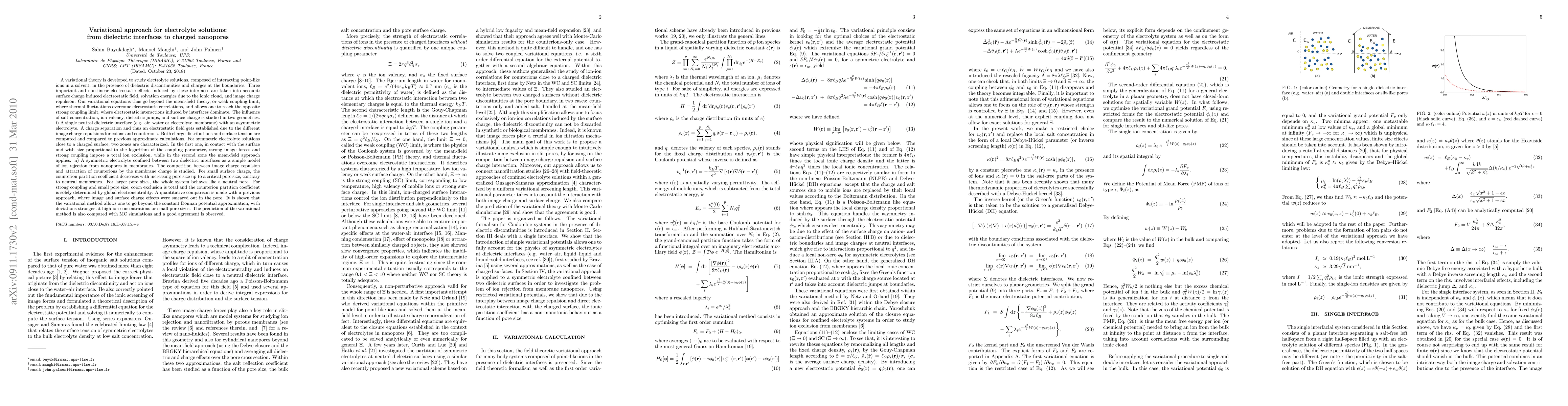 This paper develops a variational theory to study electrolyte solutions near dielectric interfaces and charged nanopores, accounting for surface charge fields, solvation energies, and image charge effects. The method is applied to air-water interfaces and nanopores, showing strong ion exclusion near charged surfaces and contrasting behaviors in ion partitioning for small versus large pores.