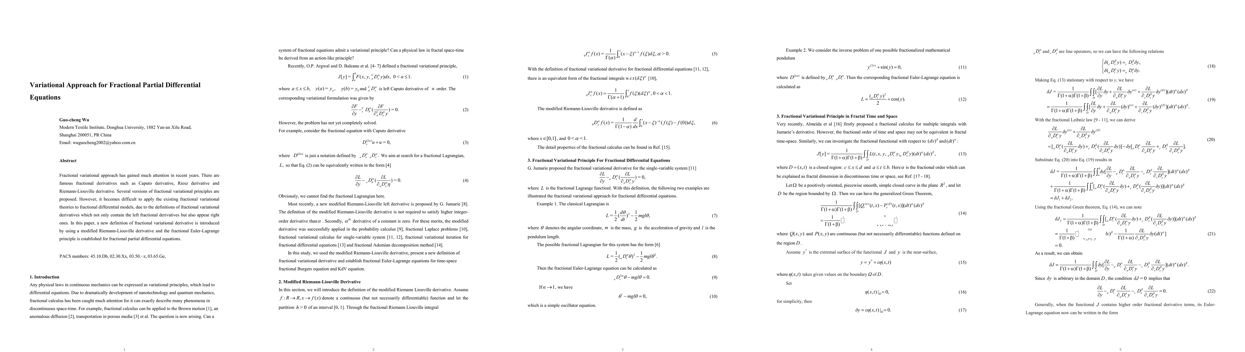 The paper introduces a new definition of fractional variational derivative using a modified Riemann-Liouville derivative and establishes a fractional Euler-Lagrange principle for fractional partial differential equations.