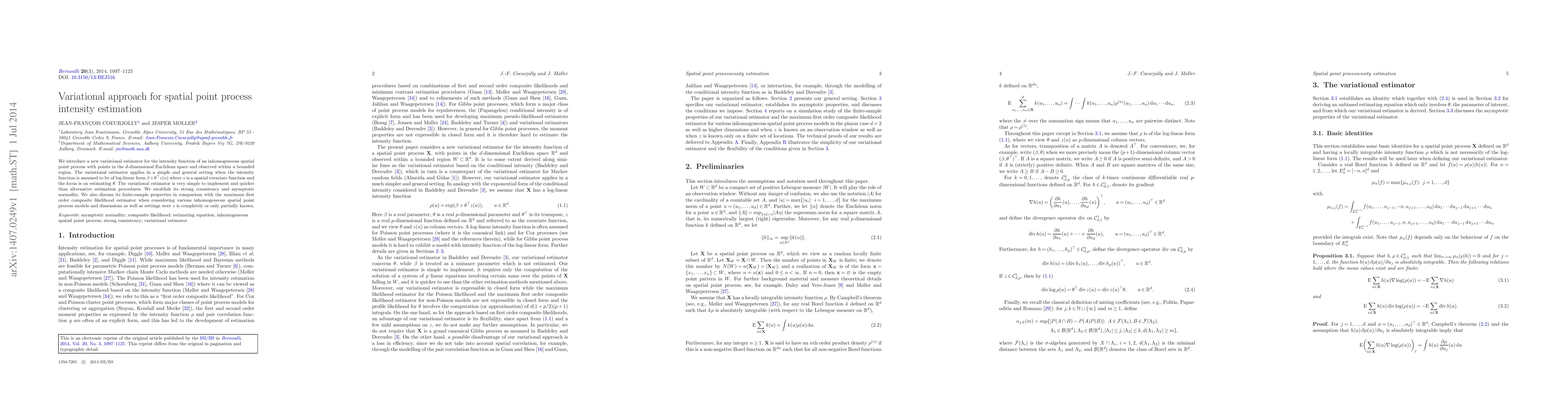 This paper proposes a new variational estimator for the intensity function of inhomogeneous spatial point processes, demonstrating its simplicity, efficiency, and strong consistency. It compares the estimator's finite-sample performance against the maximum first order composite likelihood estimator across various models and dimensions.