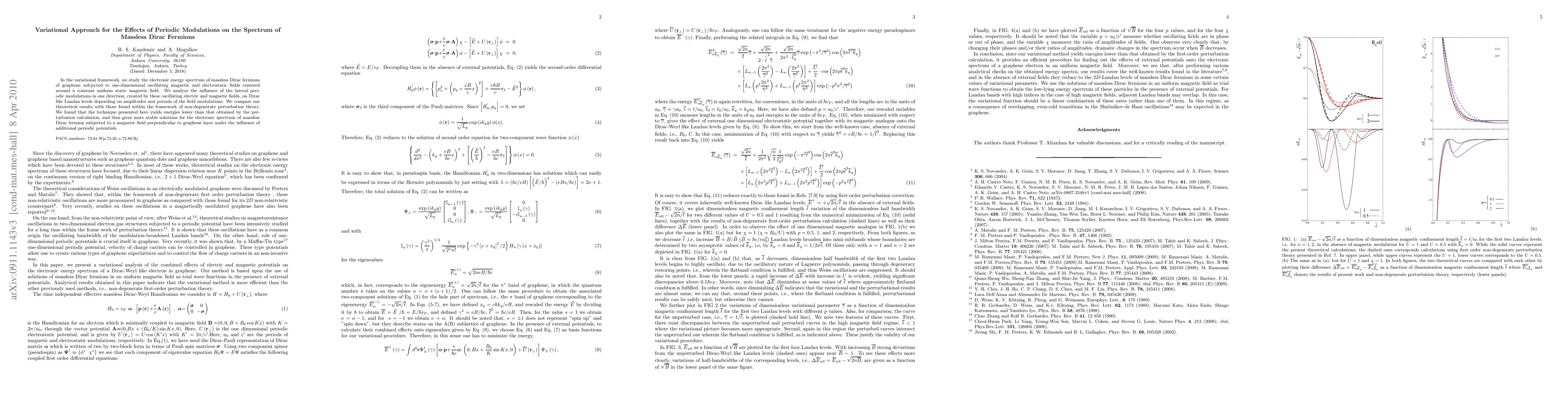 In the variational framework, we study the electronic energy spectrum of massless Dirac fermions of graphene subjected to one-dimensional oscillating magnetic and electrostatic fields centered around a constant uniform static magnetic field. We analyze the influence of the lateral periodic modulations in one direction, created by these oscillating electric and magnetic fields, on Dirac like Landau levels depending on amplitudes and periods of the field modulations. We compare our theoretical results with those found within the framework of non-degenerate perturbation theory. We found that the technique presented here yields energies lower than that obtained by the perturbation calculation, and thus gives more stable solutions for the electronic spectrum of massless Dirac fermion subjected to a magnetic field perpendicular to graphene layer under the influence of additional periodic potentials.