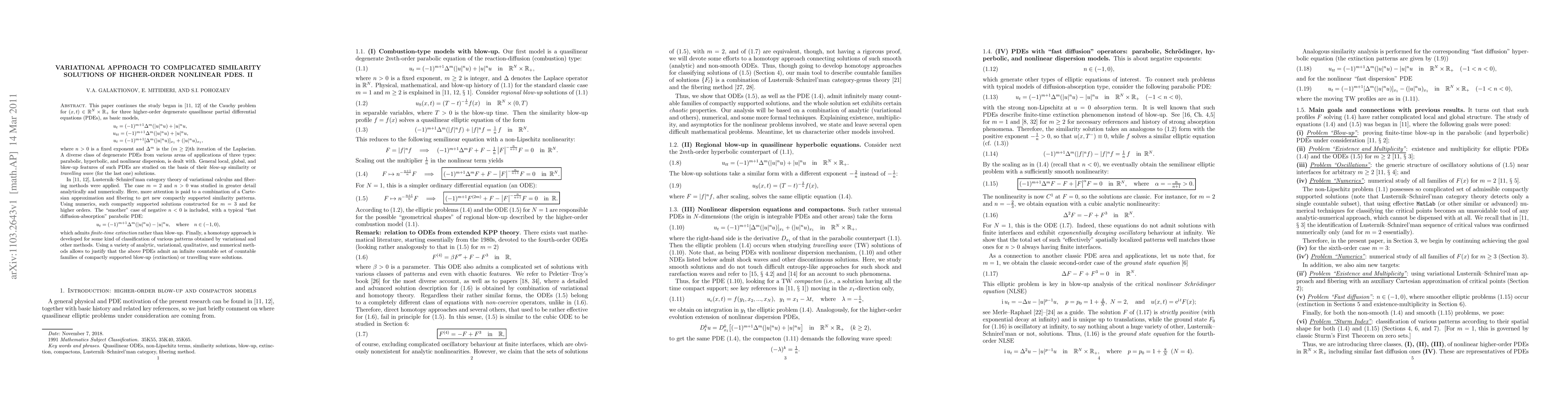 Some higher-order quasilinear parabolic, hyperbolic, and nonlinear dispersion equations are shown to admit various blow-up, extinction, and travelling wave solutions, which reduce to variational problems admitting countable families of compactly supported solutions.