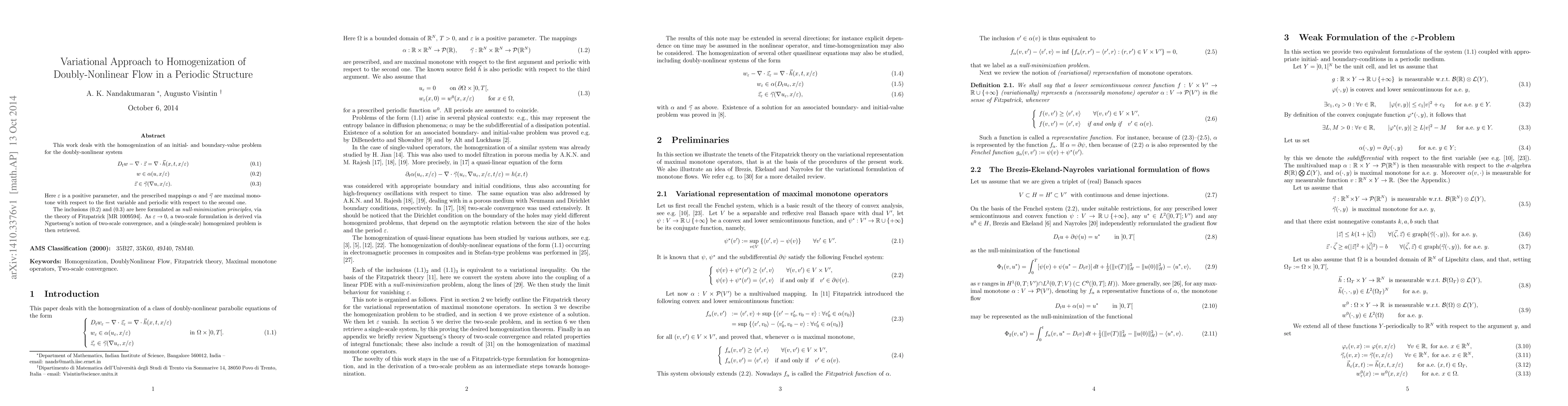 This work deals with the homogenization of an initial- and boundary-value problem for the doubly-nonlinear system $$ D_t w -\nabla\cdot \vec z = \nabla\cdot \vec h(x,t,x/\varepsilon), \qquad w\in \alpha(u,x/\varepsilon), \qquad \vec z\in \vec\gamma(\nabla u,x/\varepsilon). $$ Here $\varepsilon$ is a positive parameter, and the prescribed mappings $\alpha$ and $\vec\gamma$ are maximal monotone with respect to the first variable and periodic with respect to the second one. The two inclusions are here formulated as null-minimization principles, via the theory of Fitzpatrick [MR 1009594]. As $\varepsilon\to 0$, a two-scale formulation is derived via Nguetseng's notion of two-scale convergence, and a (single-scale) homogenized problem is then retrieved.
