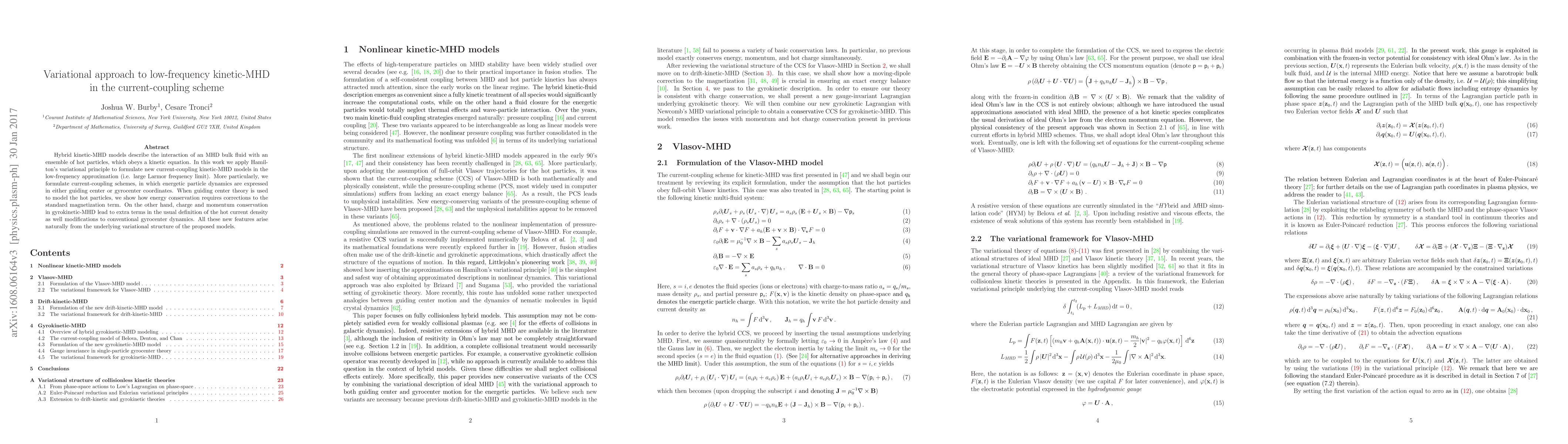 This paper develops a variational approach to formulate low-frequency kinetic-MHD models, addressing the lack of exact energy balance in Vlasov-MHD models. It introduces current-coupling schemes using Hamiltonian and variational methods, expressed in guiding-center or gyrocenter coordinates.