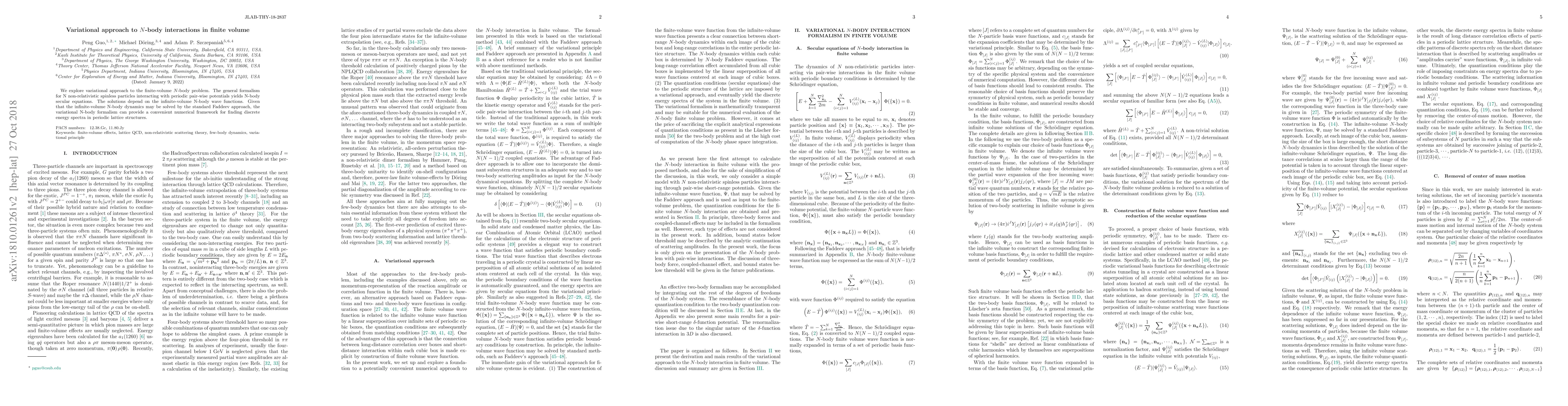 We explore variational approach to the finite-volume $N$-body problem. The general formalism for N non-relativistic spinless particles interacting with periodic pair-wise potentials yields N-body secular equations. The solutions depend on the infinite-volume N-body wave functions. Given that the infinite-volume N-body dynamics may be solved by the standard Faddeev approach, the variational N-body formalism can provide a convenient numerical framework for finding discrete energy spectra in periodic lattice structures.