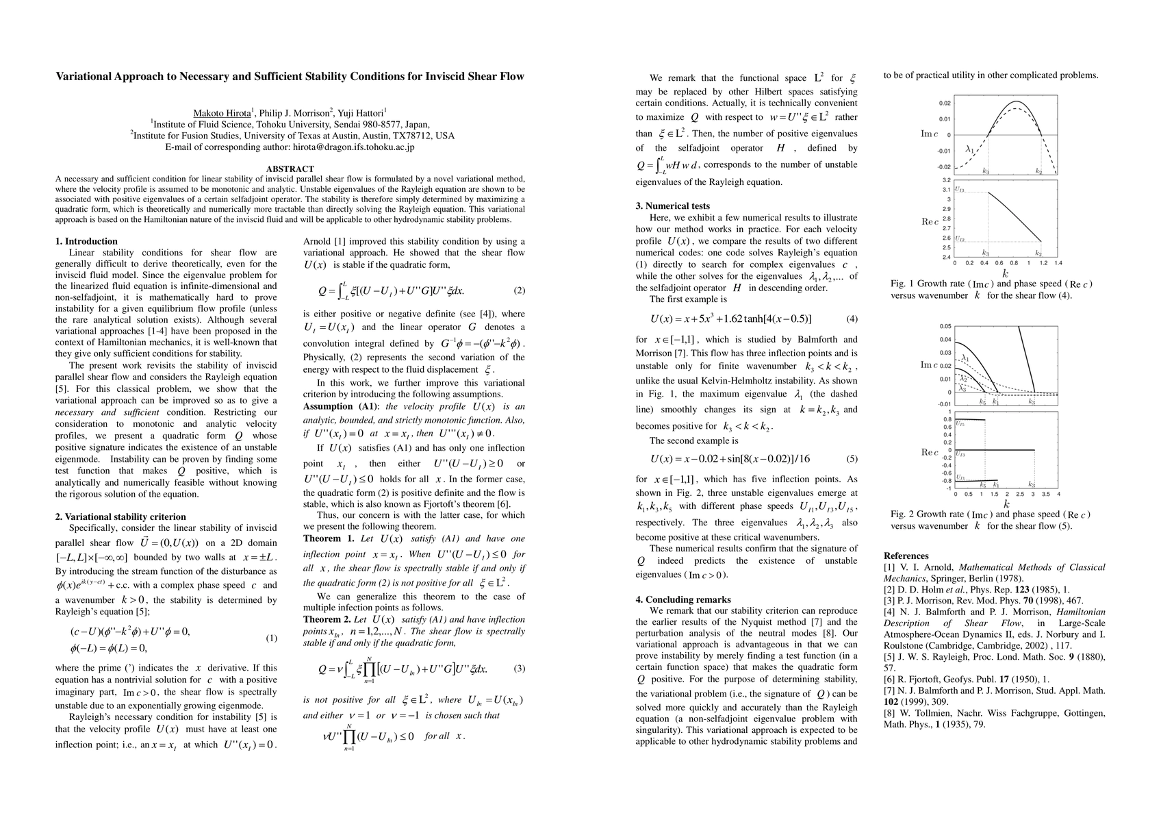 This paper proposes a variational method to determine necessary and sufficient conditions for linear stability in inviscid shear flow, showing that stability can be assessed by maximizing a quadratic form instead of solving the Rayleigh equation. The approach leverages the Hamiltonian nature of inviscid fluids and promises broader applicability to other hydrodynamic stability issues.