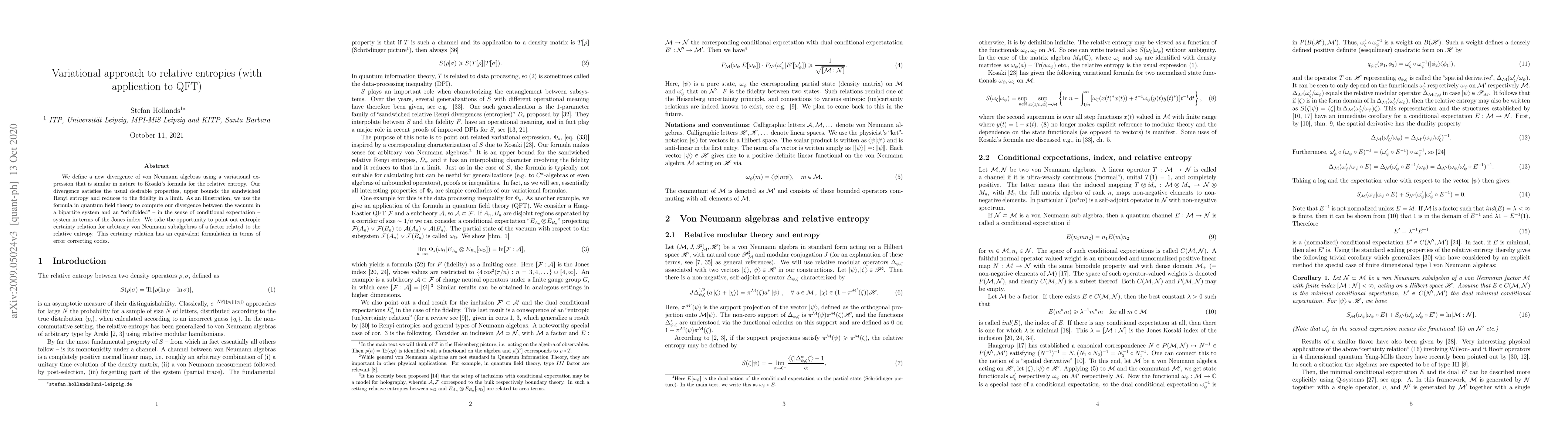 We define a new divergence of von Neumann algebras using a variational expression that is similar in nature to Kosaki's formula for the relative entropy. Our divergence satisfies the usual desirable properties, upper bounds the sandwiched Renyi entropy and reduces to the fidelity in a limit. As an illustration, we use the formula in quantum field theory to compute our divergence between the vacuum in a bipartite system and an "orbifolded" -- in the sense of conditional expectation -- system in terms of the Jones index. We take the opportunity to point out entropic certainty relation for arbitrary von Neumann subalgebras of a factor related to the relative entropy. This certainty relation has an equivalent formulation in terms of error correcting codes.
